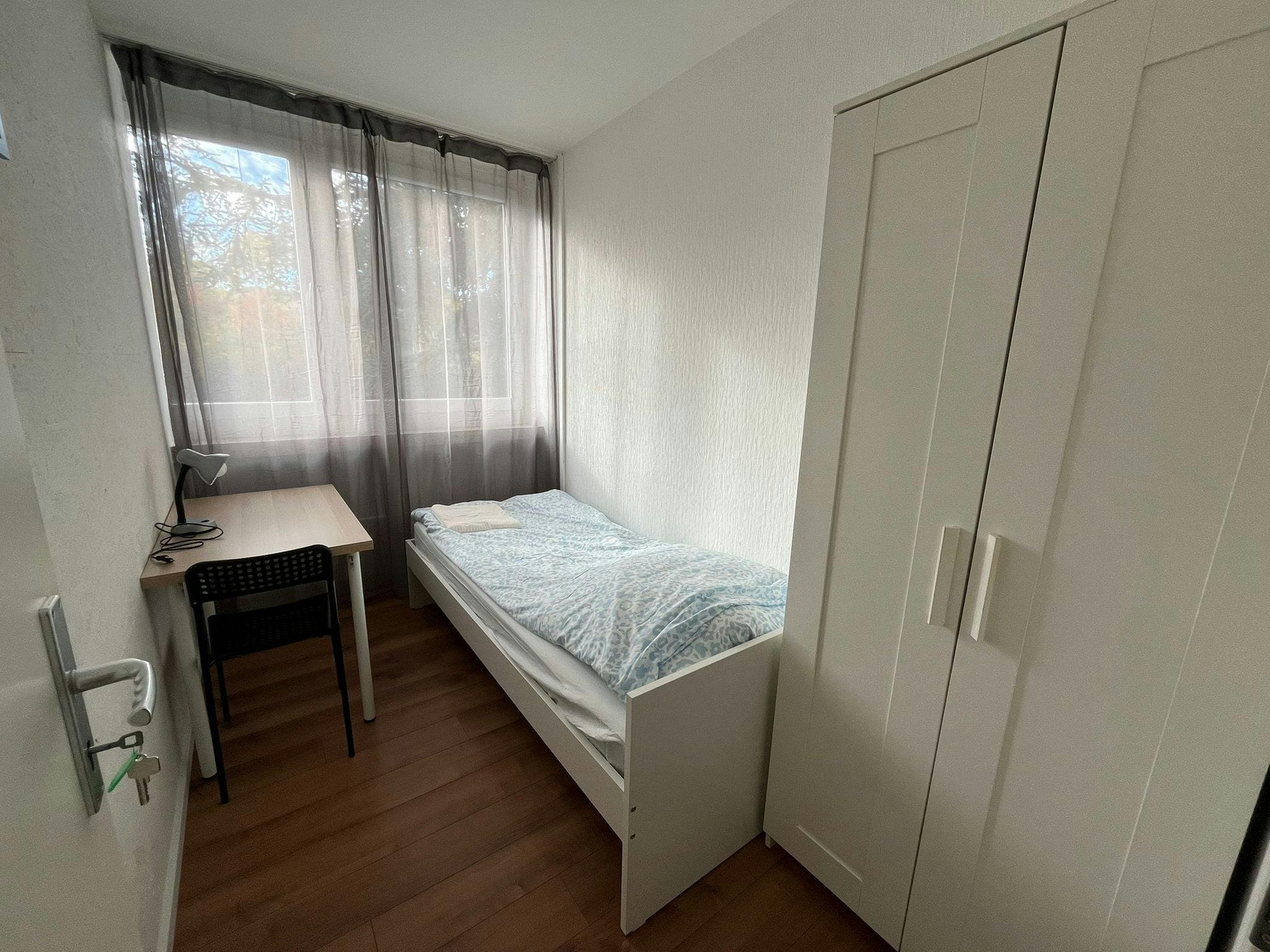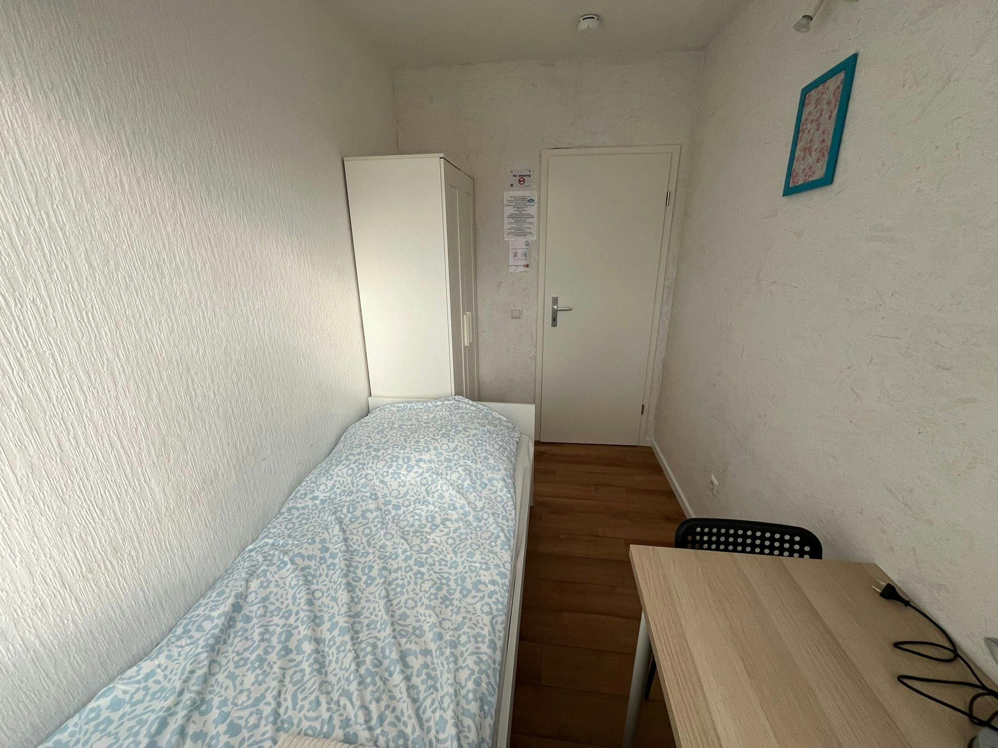 Fully Furnished Rooms: Each room includes a bed, work table, chair, and wardrobe.