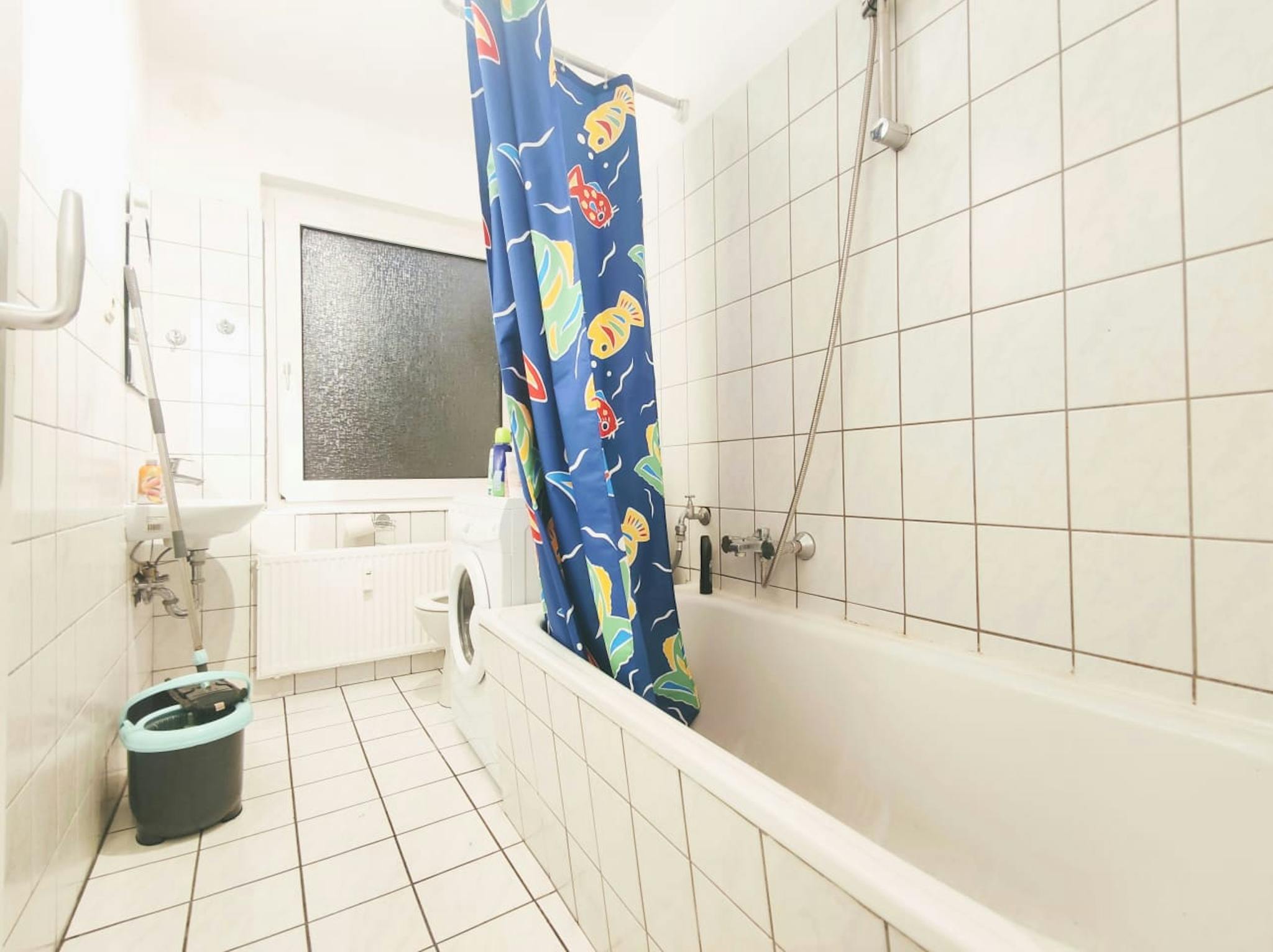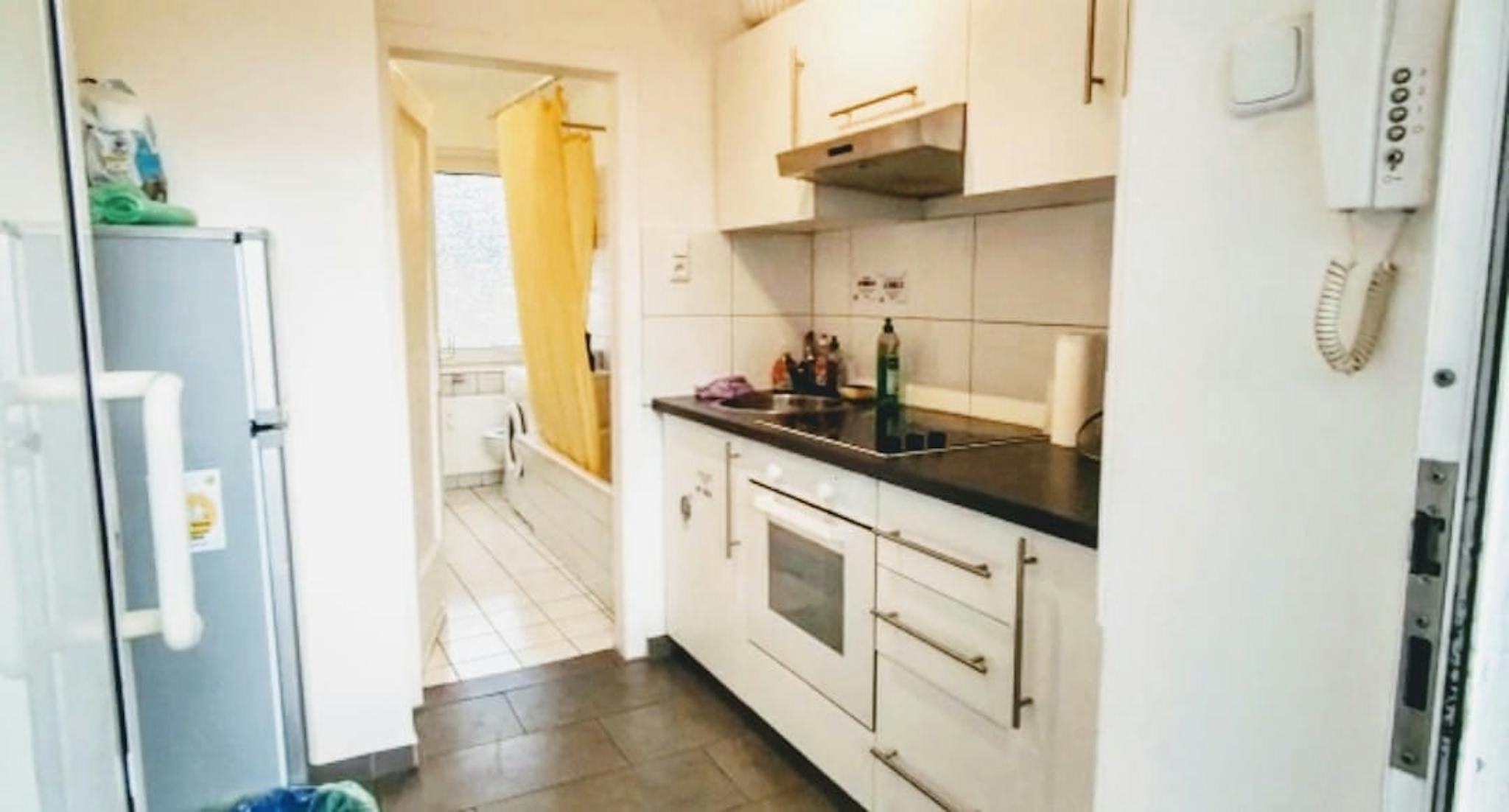 Shared kitchen and bathroom with WC, used by four flatmates in total.