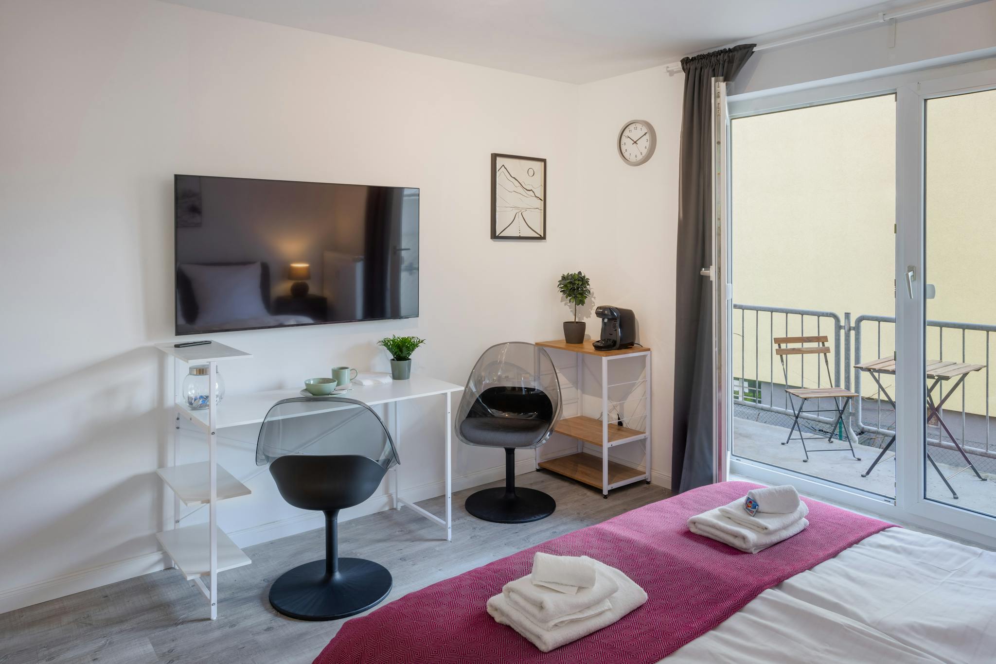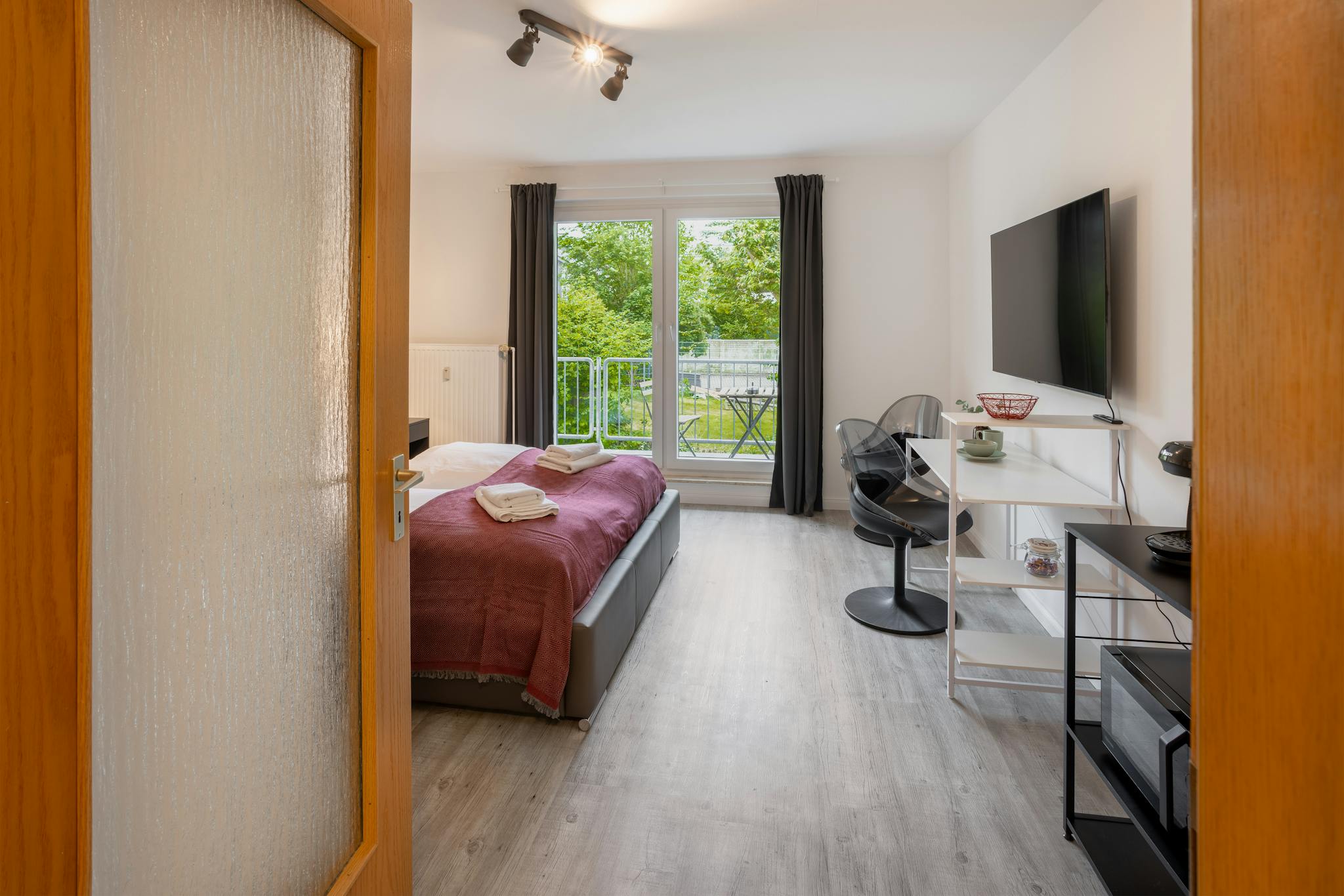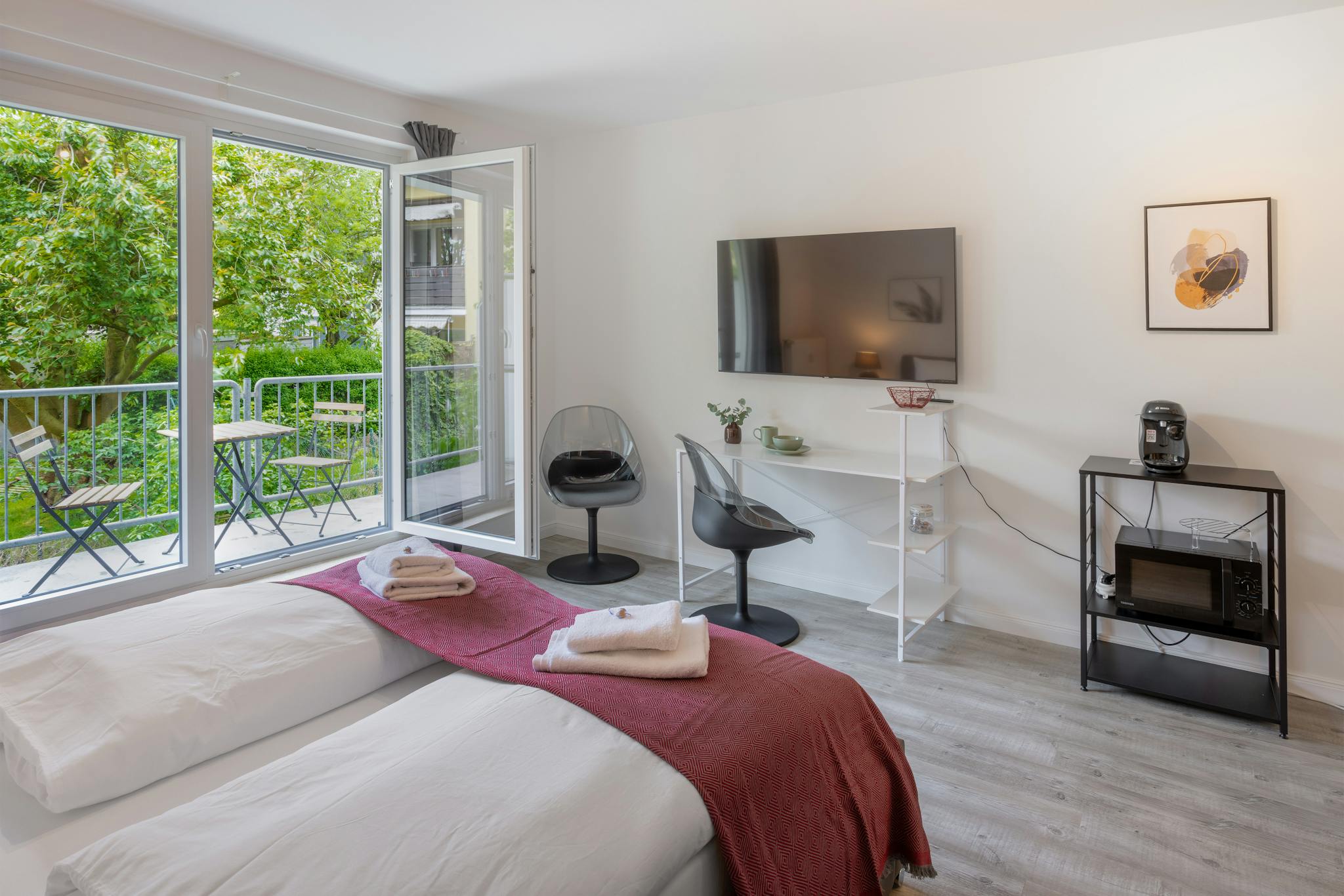 Non-SmokingNot allowedEntspanntes Wohnen im Grünen: Dieses ruhige Studio-Apartment mit Blick auf den Garten verspricht Erholung pur. Genieße den eigenen Balkon, Parkplatz & eine vollausgestattete Küche. Mit dem modernen TV endet dein Tag gemütlich. Die Straßenbahn direkt vor der Tür bringt dich in 15 Min. in die Stadtmitte oder zum Hauptbahnhof. Der Flughafen ist ebenfalls nur 15 Autominuten entfernt – ideal für Studenten und Business-Reisende, die eine ruhige Oase mit schneller Anbindung suchen.