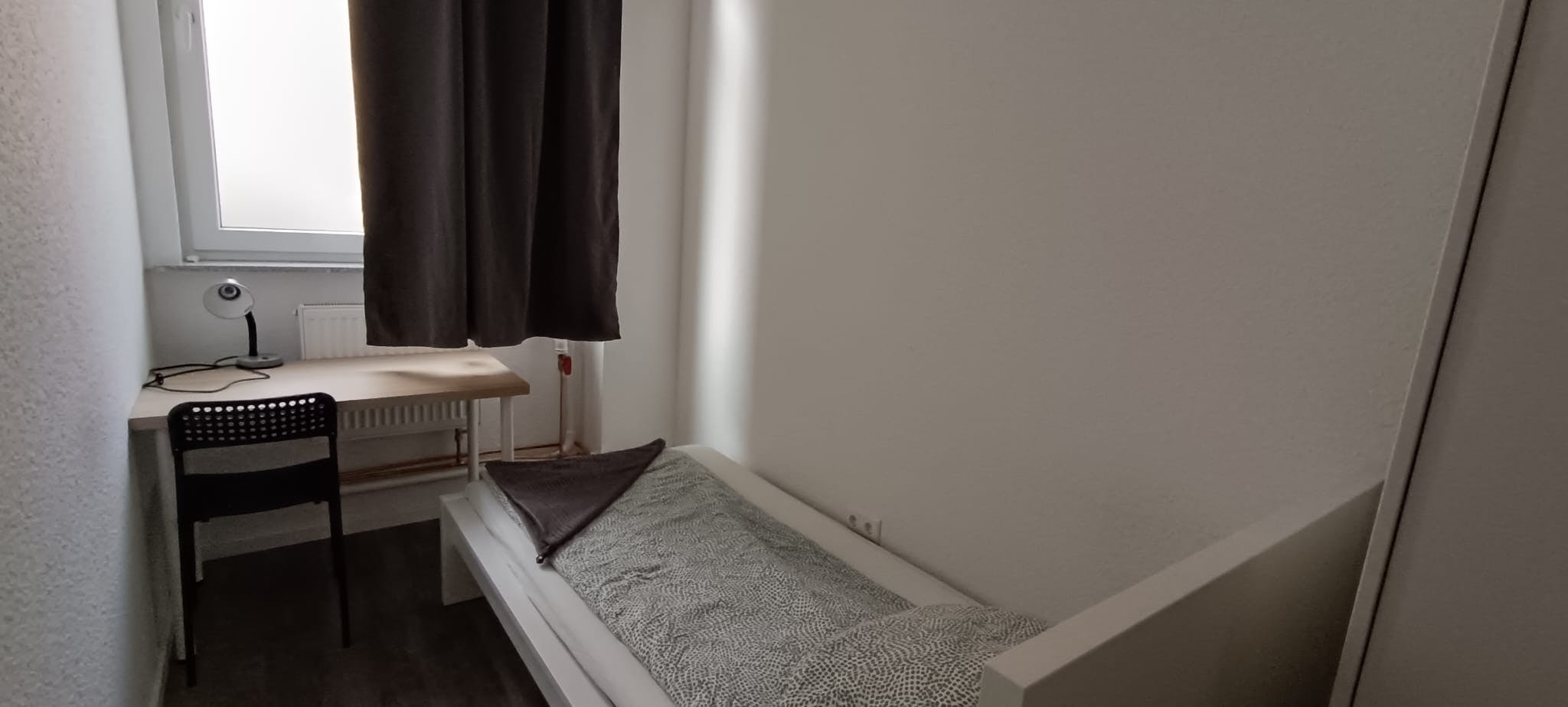 Furnished Room: Each room includes a desk, chair, open wardrobe, and bed.