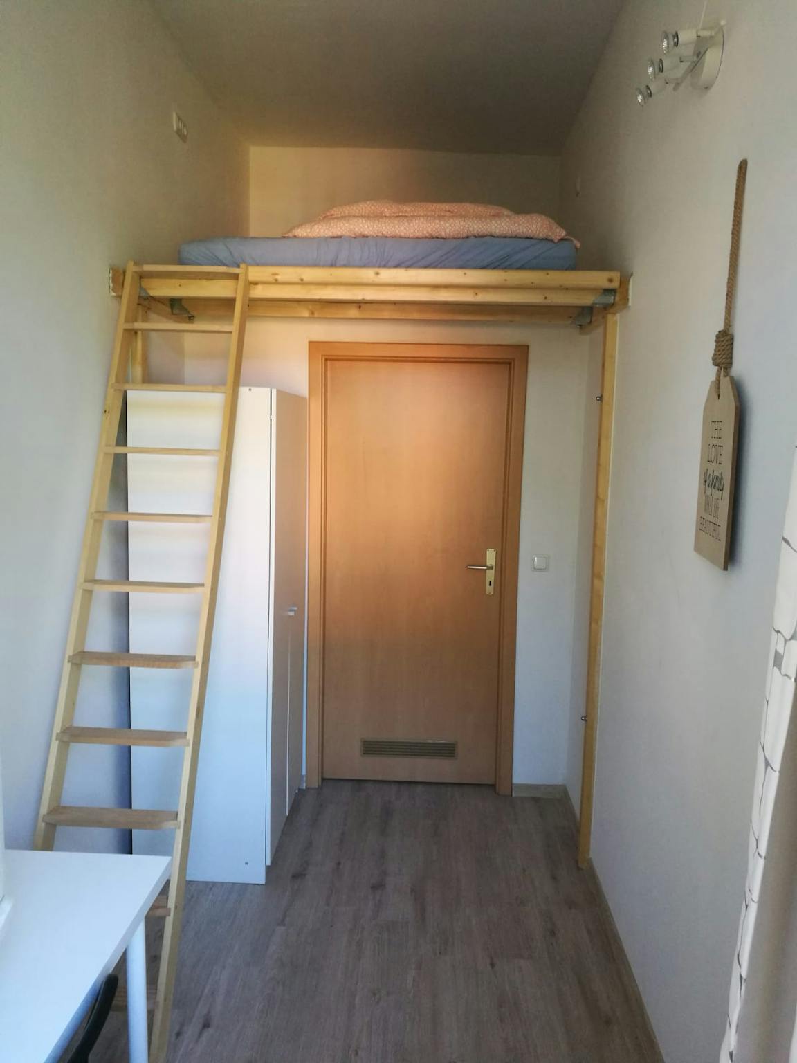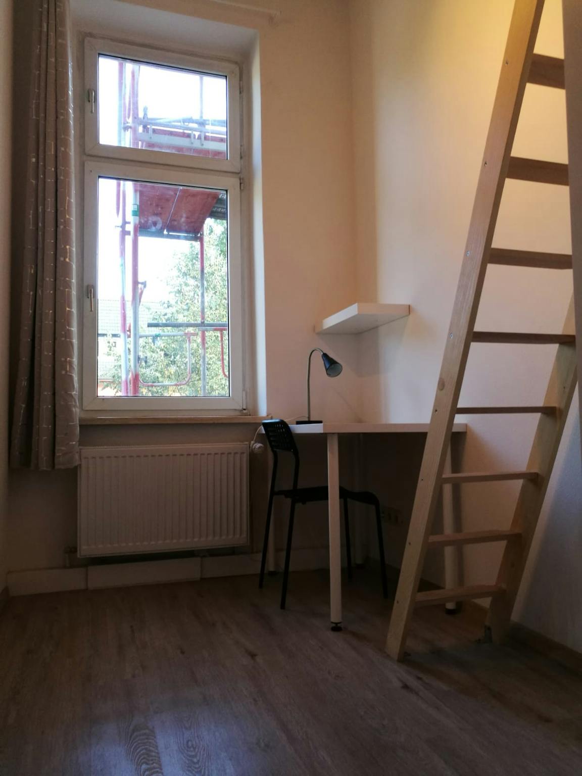 Fully furnished rooms, including a bed, desk, wardrobe, and lamp.