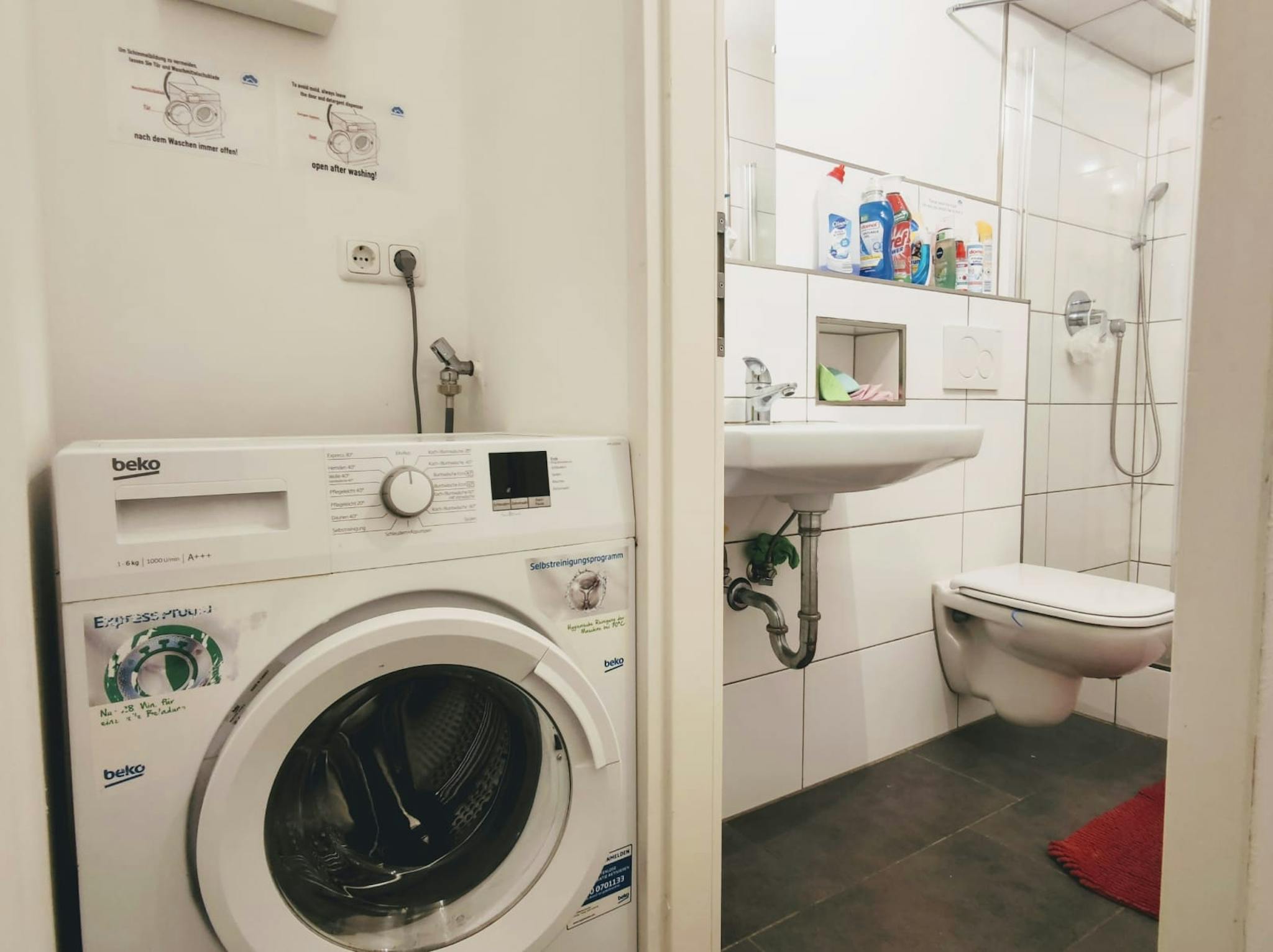 A coin-operated washing machine available in the basement for 2 EUR per wash.