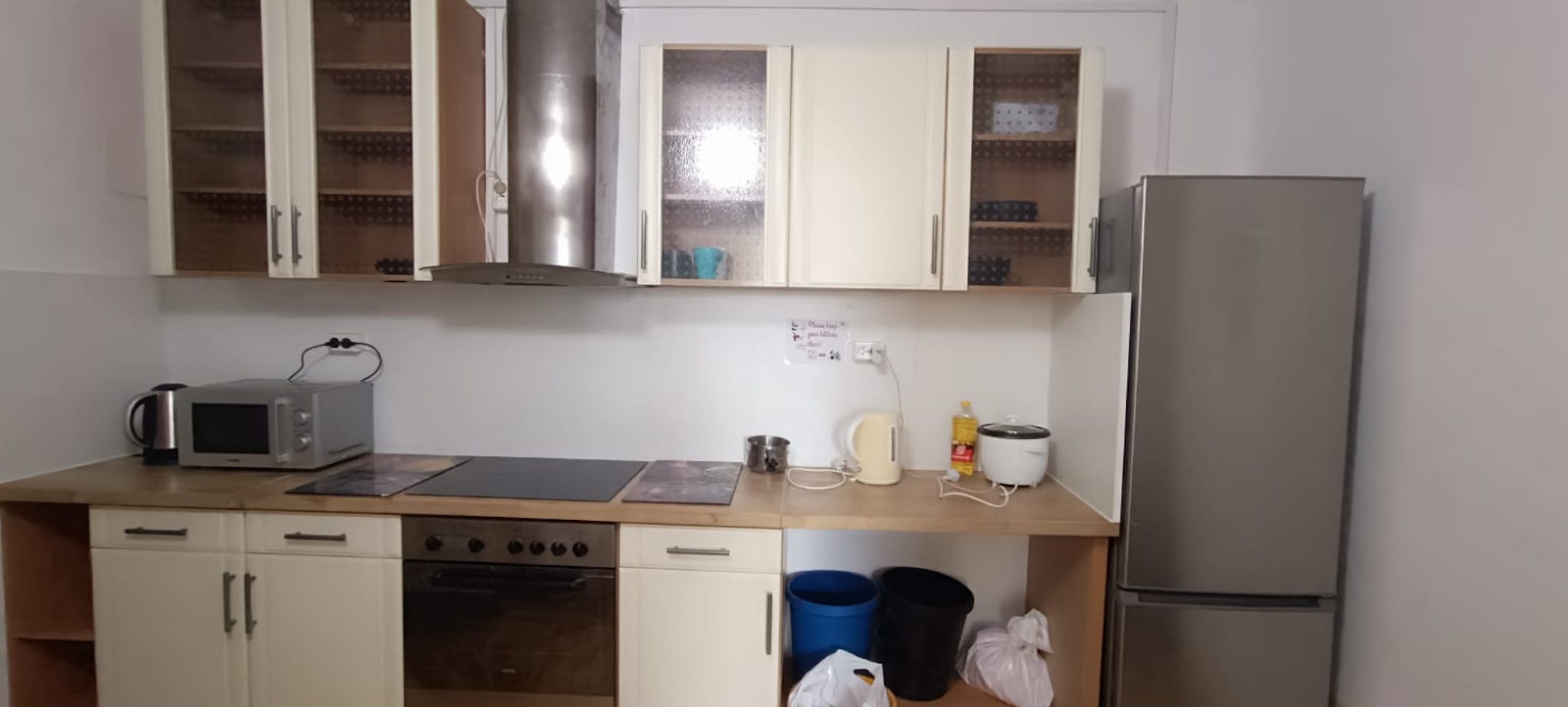 Compact kitchen equipped with electric kettle, refrigerator, microwave, dishes, and cutlery.