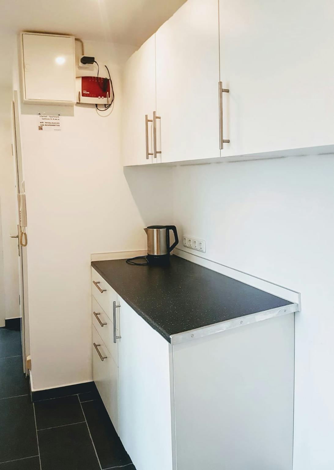 Fully equipped kitchen with an electric kettle, refrigerator, microwave, dishes, and cutlery.