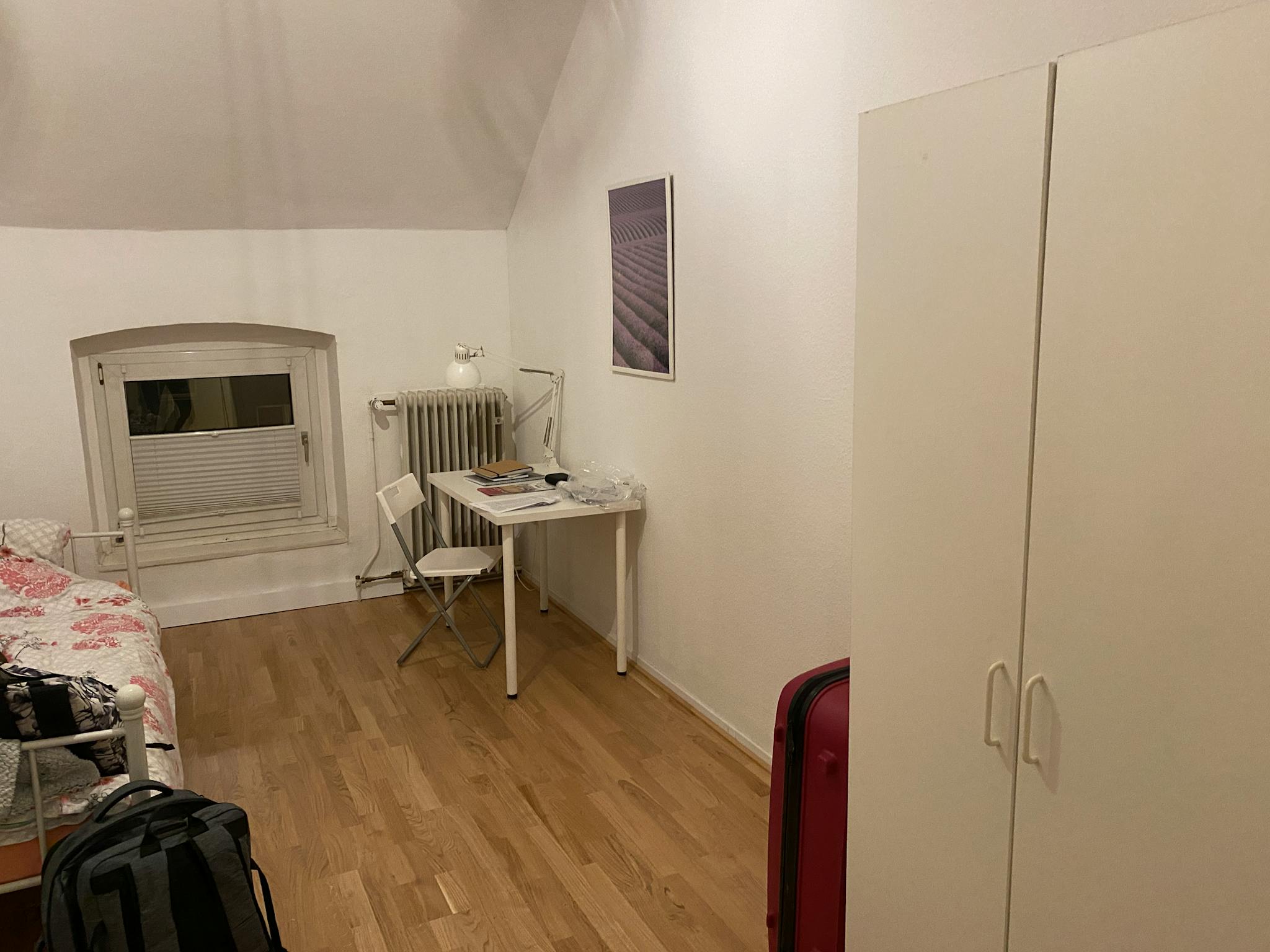 Non-SmokingNot allowedThis is a nice room (Ap. 12) in a 5-room-shared flat (i.e. 4 flatmates, only female) with shared bathroom, large kitchen and guest toilet. The room has newly laid real oak parquet flooring and is fully furnished: desk, wardrobe, bed with high-quality mattress etc. The flat has fully fitted kitchen (with hob, oven, fridge, sink etc.), new washing machine in basement, cutlery, pots, dishes etc. Parking is available directly on the street or in the side streets. Smoking and animals are unfortunately not allowed. A large, quiet and very sunny garden is at the tenants' disposal. Free Wi-Fi (up to 150 MBit).