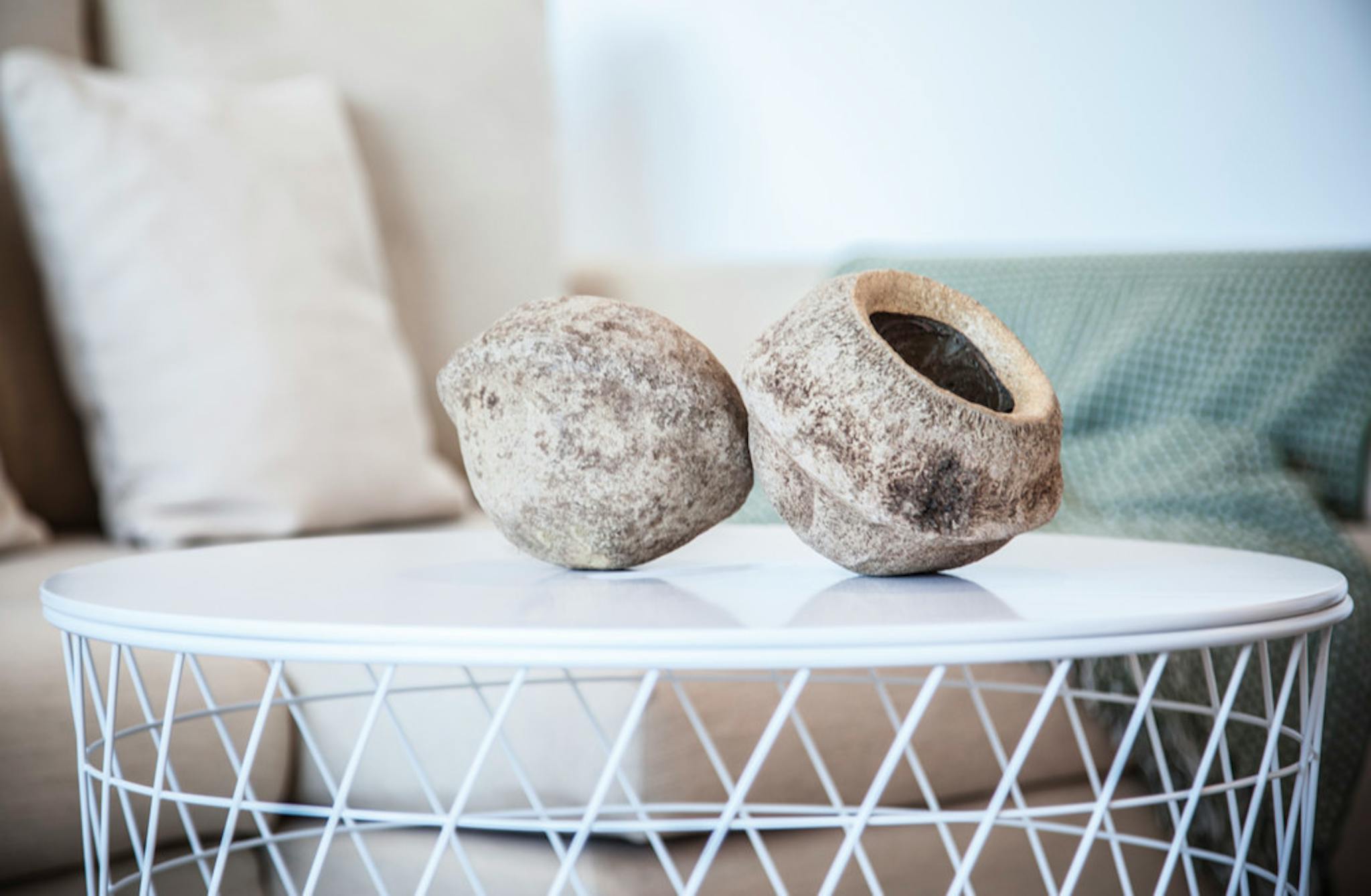 The living area is furnished with a comfortable couch with a coffee table, a large dining table and a smart TV.