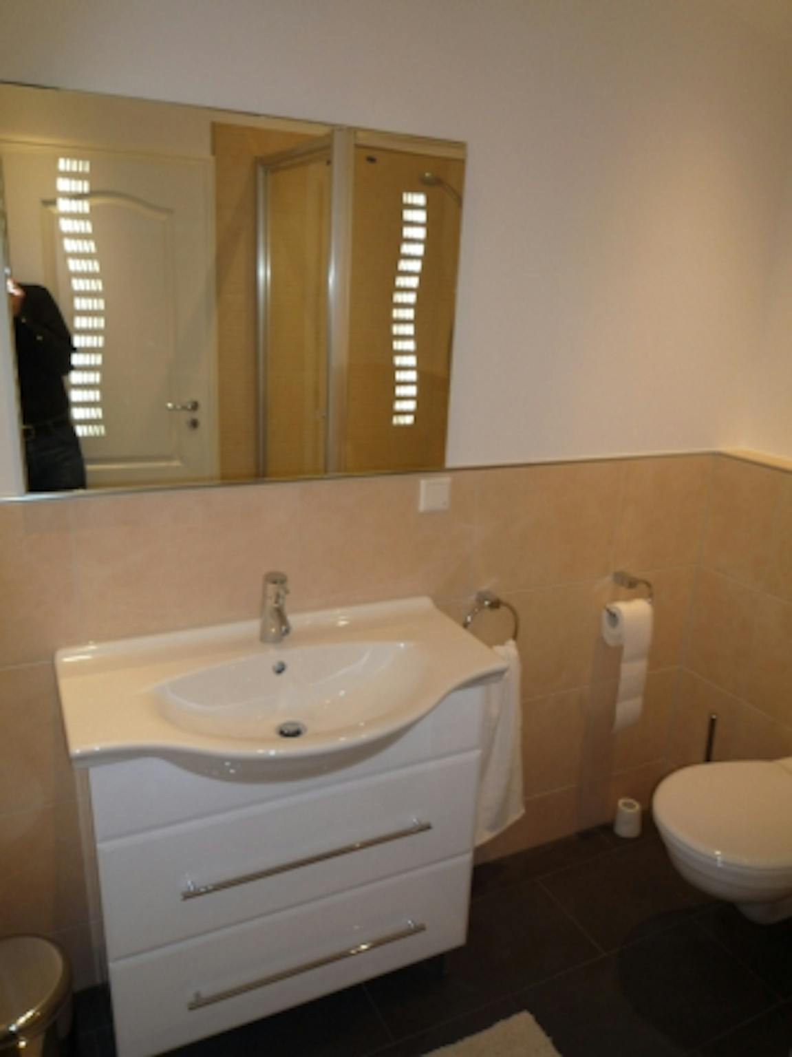 Das Badezimmer überzeugt durch die moderne Gestaltung mit Dusche und Handtuchheizung.