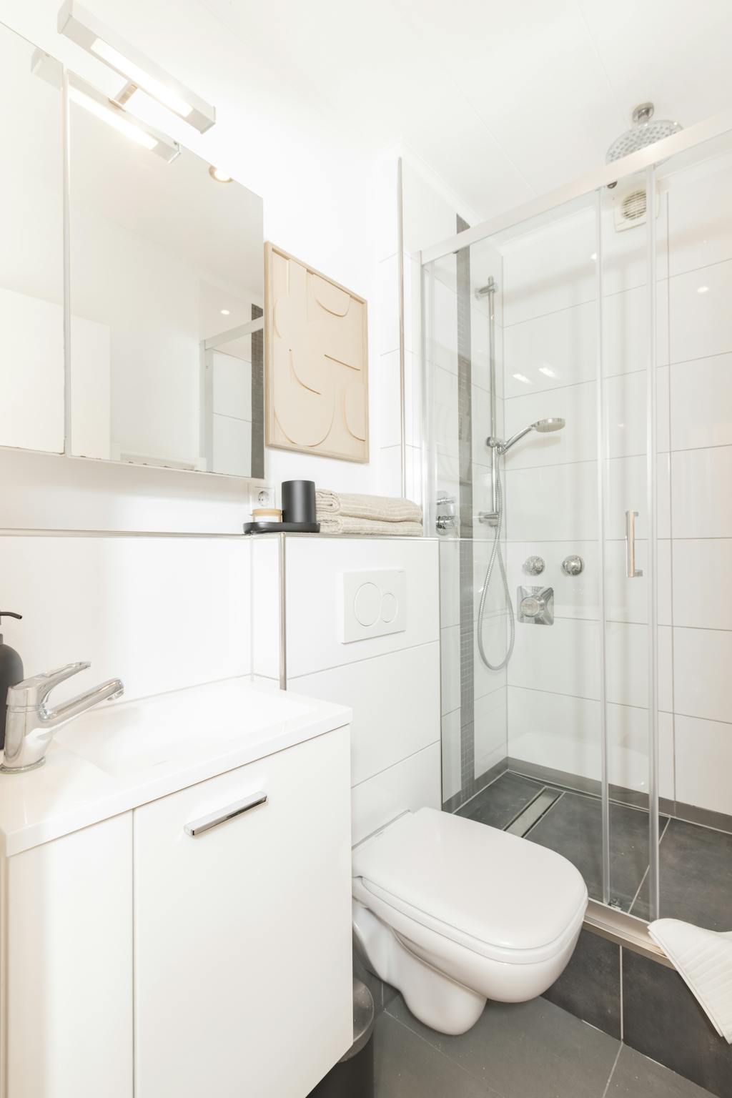 Das Badezimmer ist mit einer begehbarer Dusche ausgestattet.