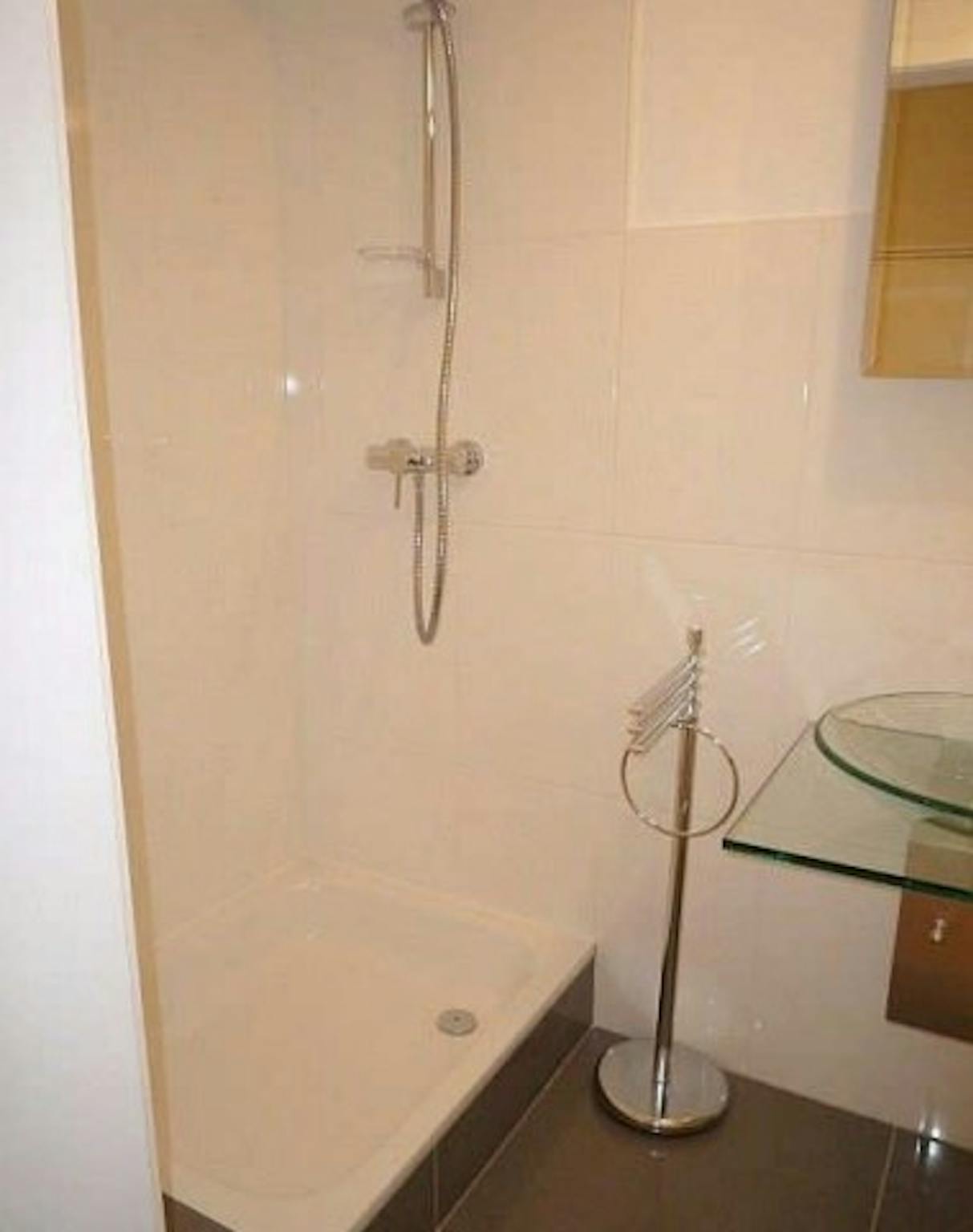 The bathroom shows an elegant white with shower and a glass bassin. It suits the modern optic like the rest of the studio.