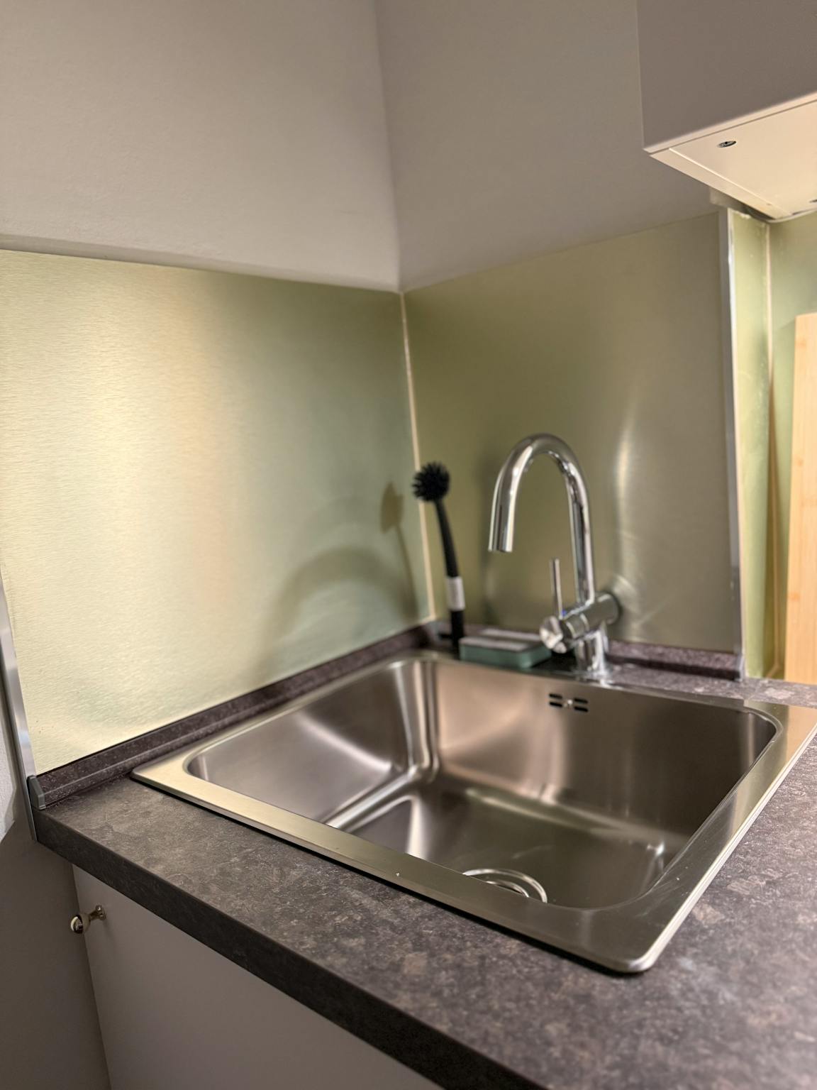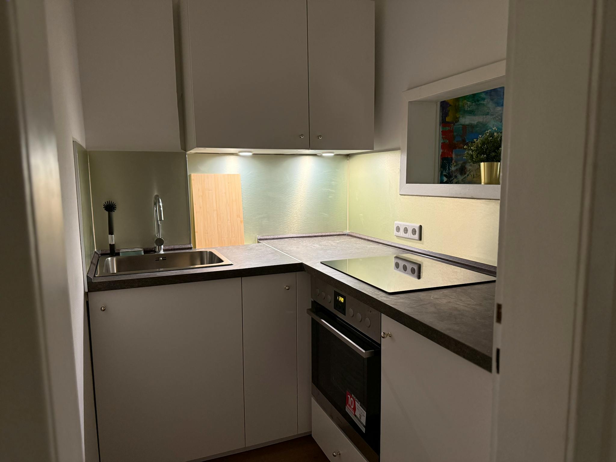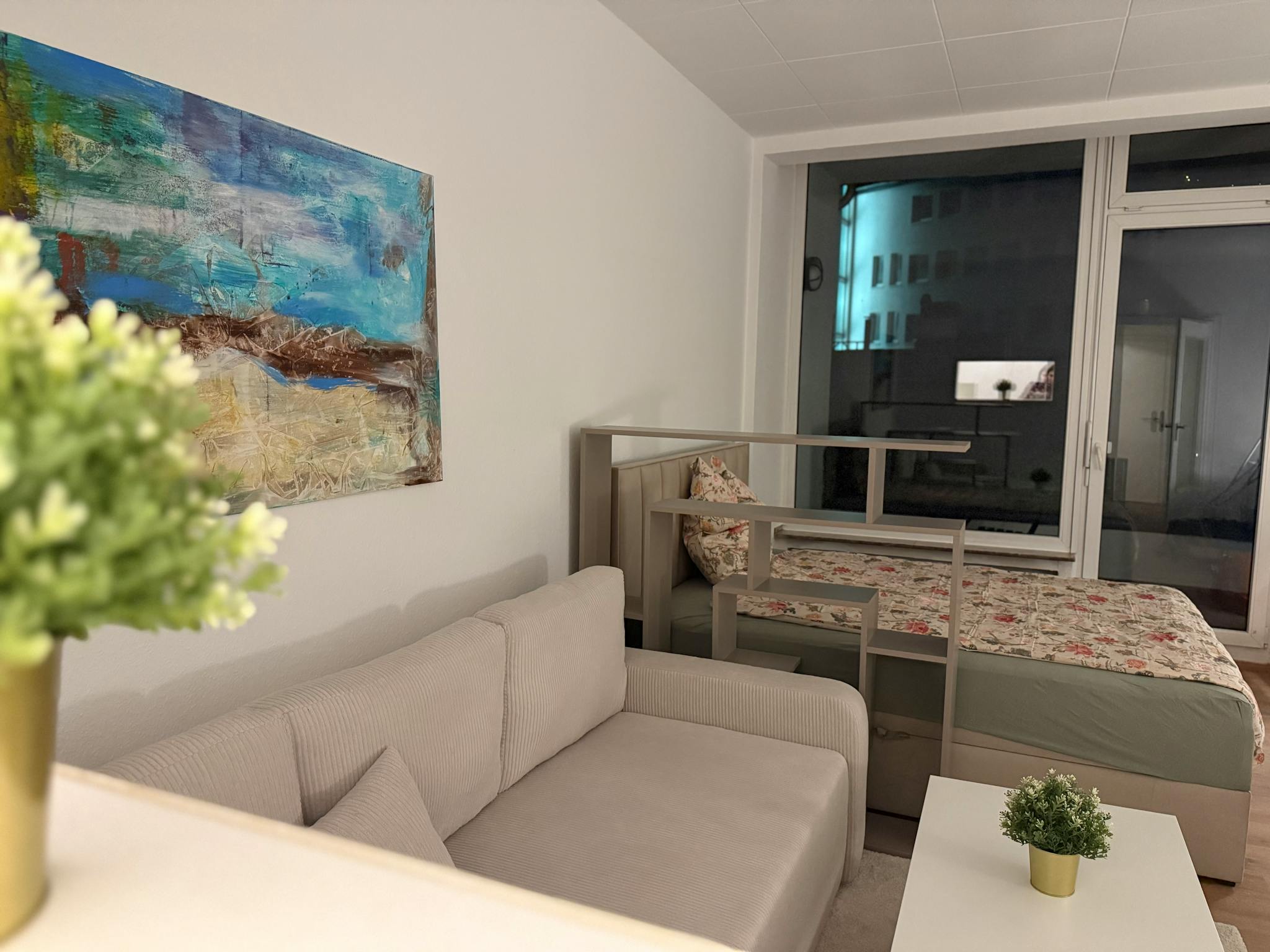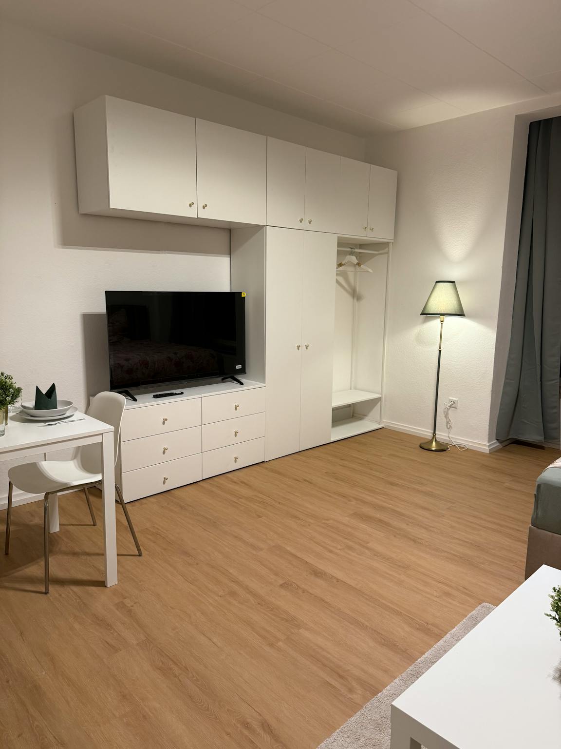 The apartment features a brand-new bathroom with bathtub and is newly furnished with high-quality pieces – including a super comfortable 160 cm wide box-spring bed, a work desk, a 55-inch Smart TV, and high-speed Wi-Fi. A kitchenette with all essential appliances and utensils makes the studio completely self-sufficient. Large windows fill the room with natural light. Edeka Zurheide (Crown Düsseldorf), one of the largest and most exclusive supermarkets in Europe, is located just across the street.