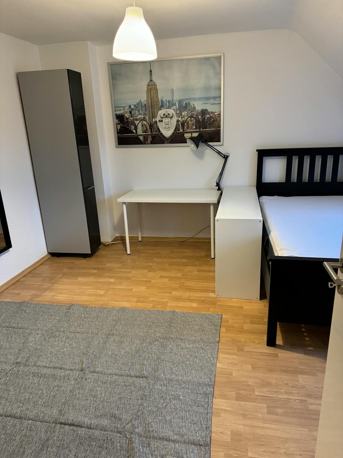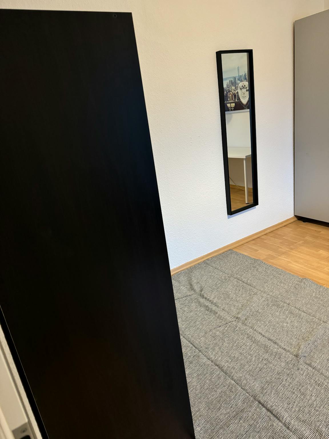 Du hast ein Schlafzimmer mit einem großen 1,40 × 2,0m Bett, einem Kleiderschrank, der viel Platz für Stauraum bietet und einen Kallaxregal für mehr Stauraum.