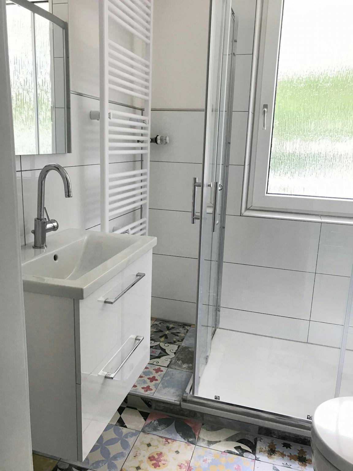The bathroom has a spacious walk-in shower with 2 day-light windows.