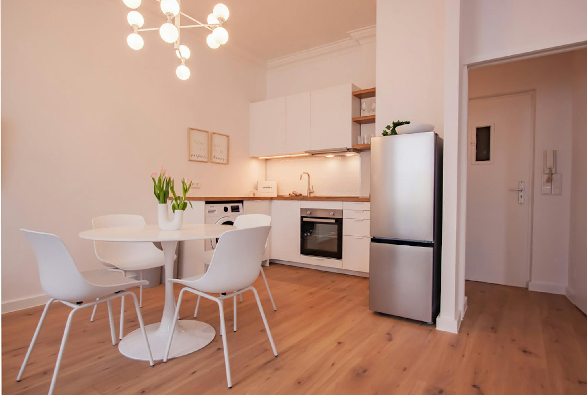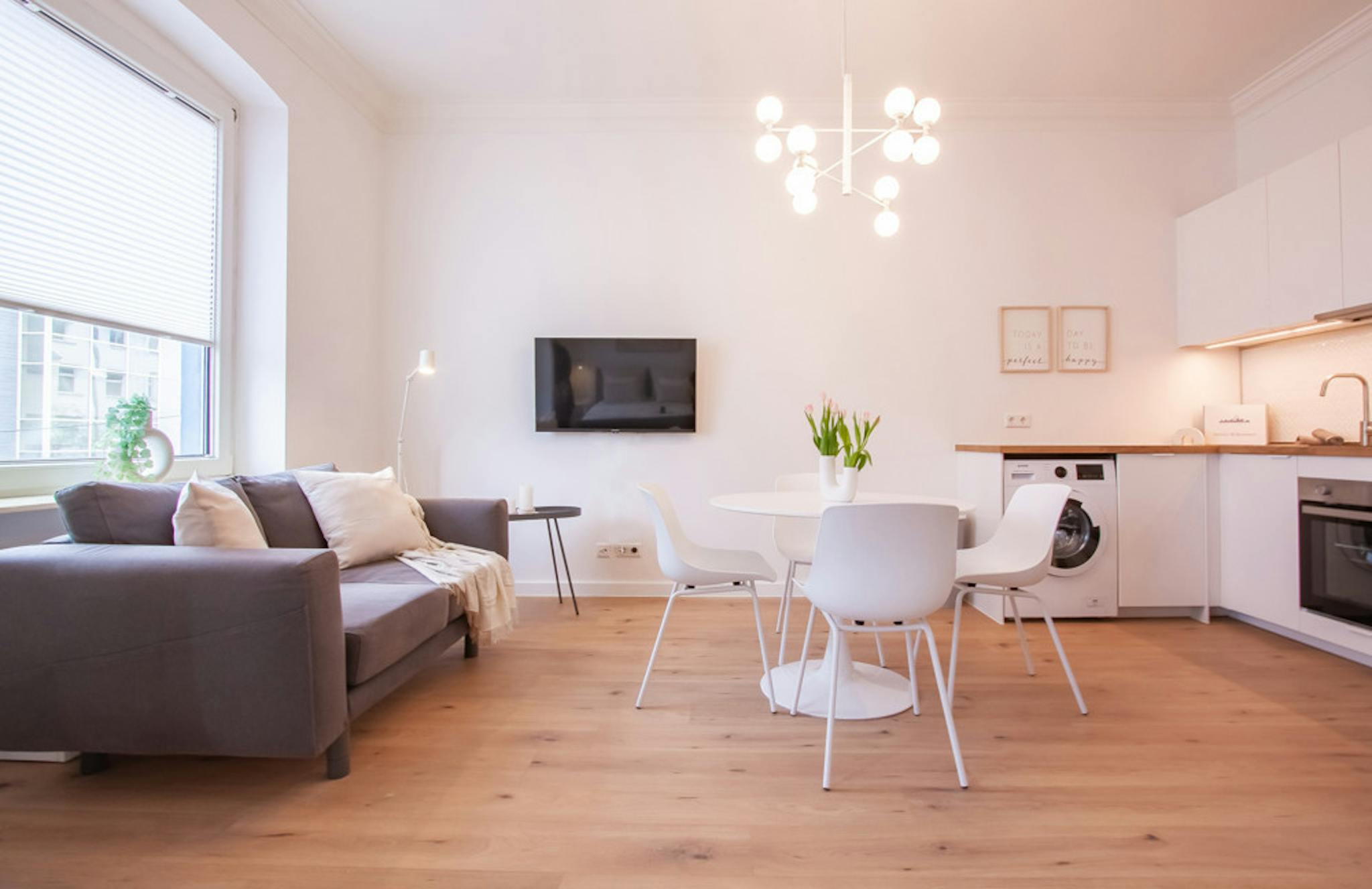 Non-SmokingNot allowedOur fully equipped apartment provides you with all the amenities for your daily needs. The kitchen comes with all the cooking utensils and includes an oven, a ceramic stovetop, an extractor hood, a toaster, and a coffee machine. The bathroom tastefully combines classic elements with modern design. In the living and sleeping area, you'll find a spacious built-in wardrobe, a comfortable double bed (140cm x 200cm), and a dining table that can also serve as a workspace. Additionally, the apartment features a cozy couch and a Smart TV for your entertainment. Furnished with modern home accessories, our apartment offers a particularly inviting ambiance.