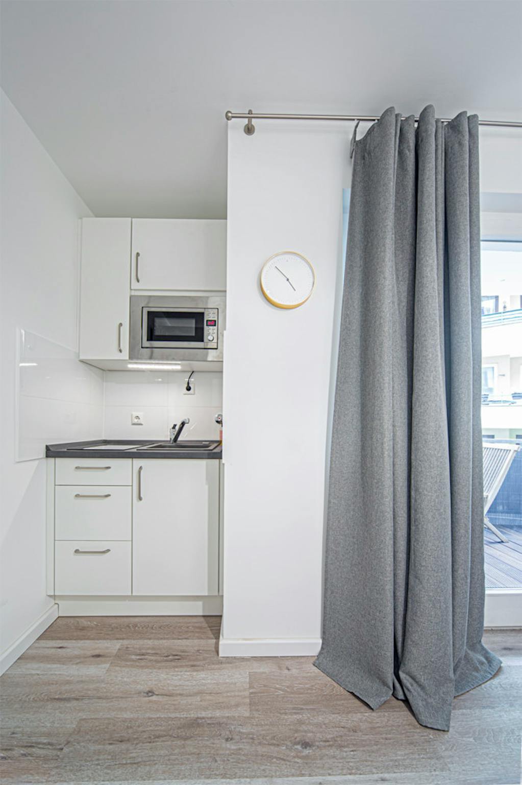 The living/sleeping area is equipped with a comfortable bed (120x200) for a good night's rest, a large closet to store your belongings and a smart TV. Modern home accessories ensure a very special feel-good character. The balanced mix of classic elements and modern design describes the style of the apartment. The separate kitchen offers everything you need for your daily needs, as well as the modern bathroom. The balcony facing the inner courtyard invites you to linger.