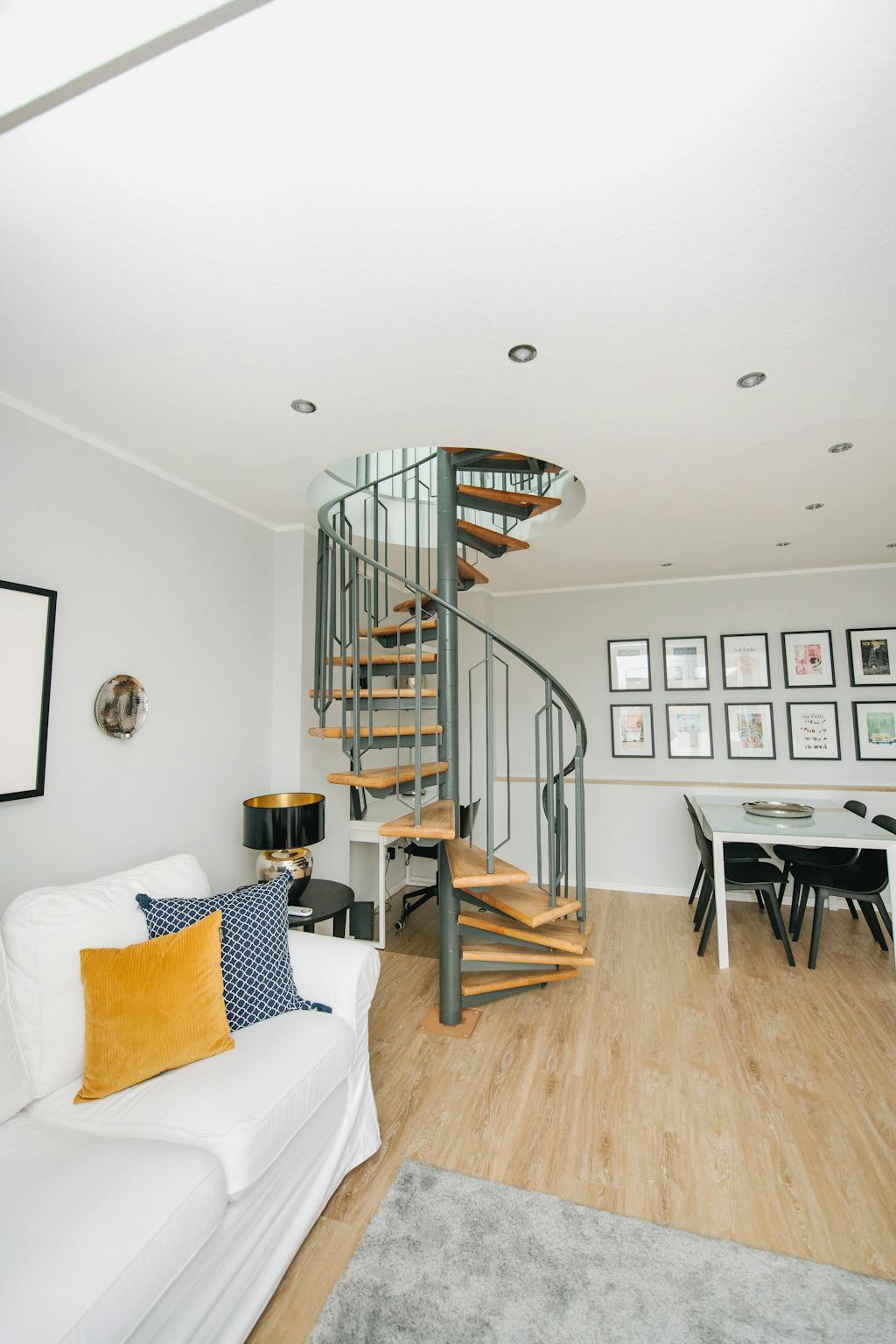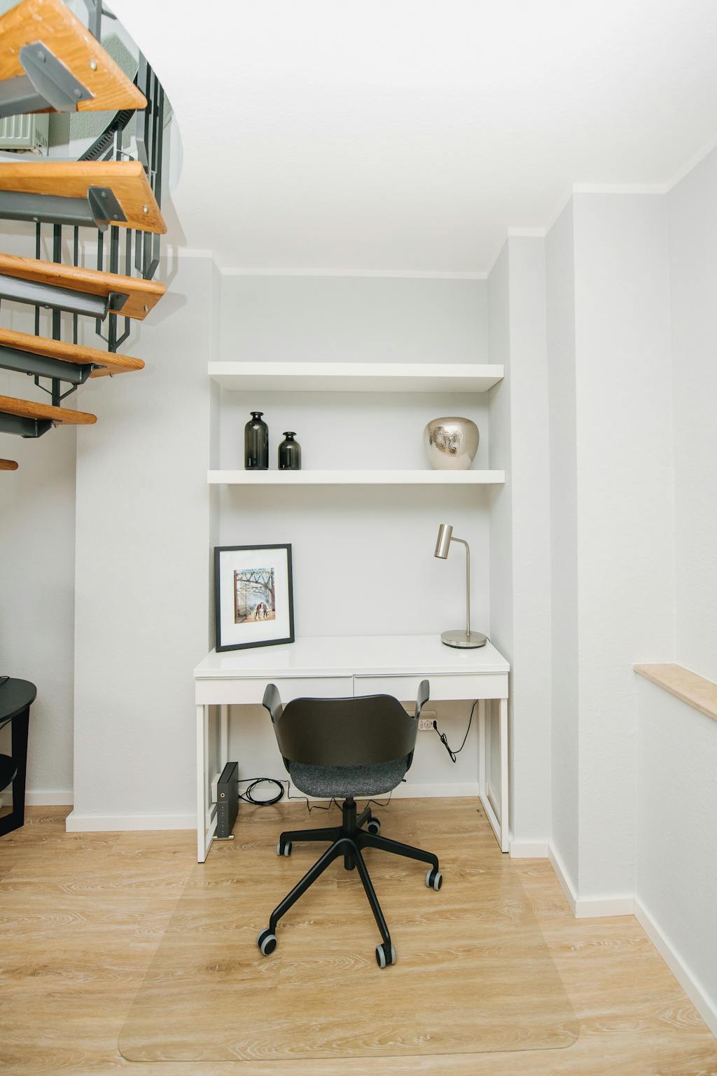 In den oberen Bereich gelangt man über die Wendeltreppe. Hier befindet sich der Schlafbereich (Bett mit 120 x 200 cm Matratze). Ein großer Einbauschrank und ein Einbau-Regal bieten enorm viel Stauraum. En-suite befindet sich das Bad mit WC, Wanne und Fenster. Hier gelangt man auch auf die kleine Terrasse, auf der man einen wunderbaren Blick über die Dächer des Stadtteils Flingern hat.