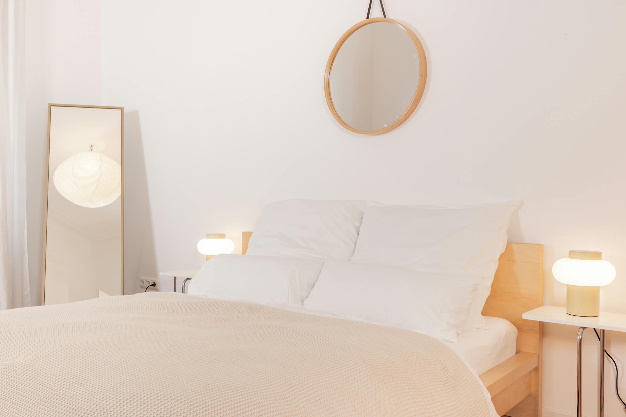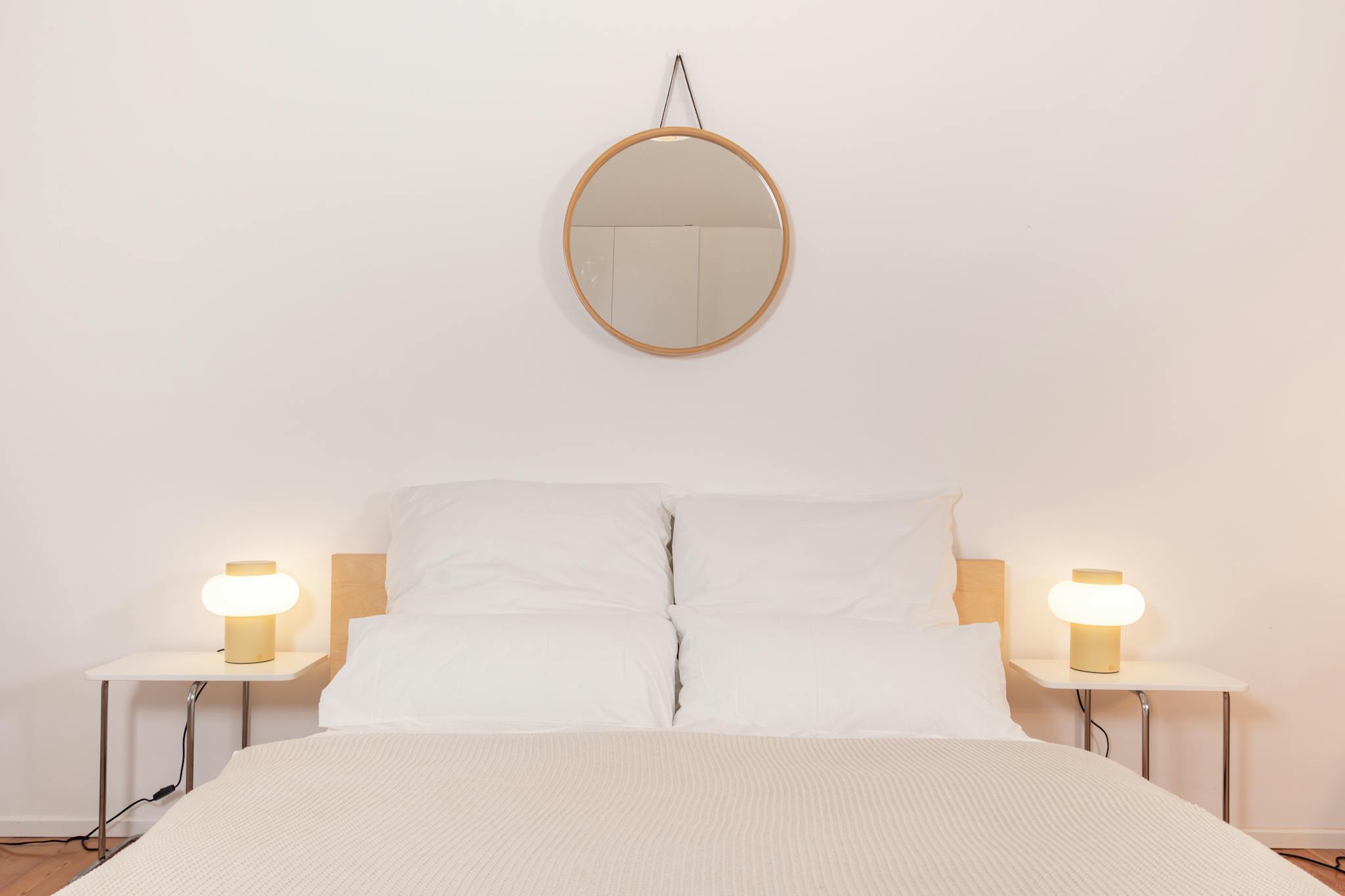 Das Schlafzimmer, ist mit einem großen Einbauschrank, einem Doppelbett, einem Kommode und einem Beistelltisch ausgestattet.