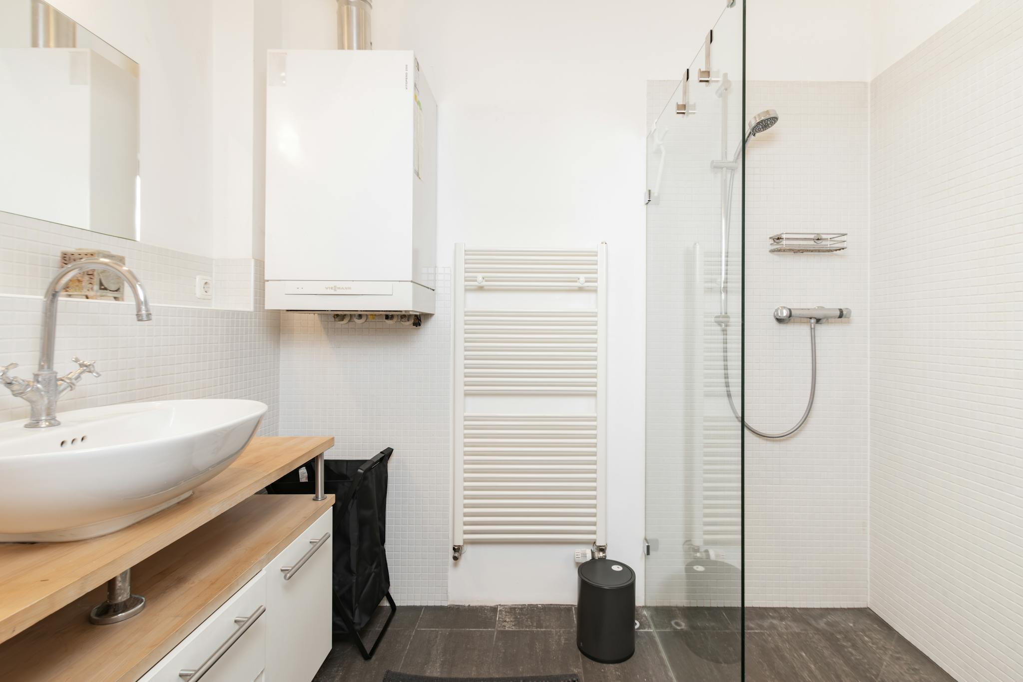 Die ausgewogene Mischung aus klassischen Elementen und modernem Design beschreibt das, mit einer ebenerdigen Dusche, ausgestatteten Badezimmer.