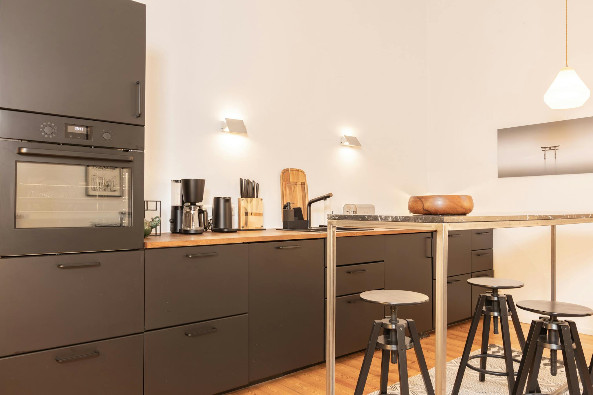 Die Küche verfügt über Kochutensilien, Backofen, Ceranfeld, Spülmaschine, Wasserkocher, Toaster, Kaffeemaschine und einer Theke mit Hockern. Des weiteren ist in der Küche ebenfalls eine Waschmaschine verbaut.