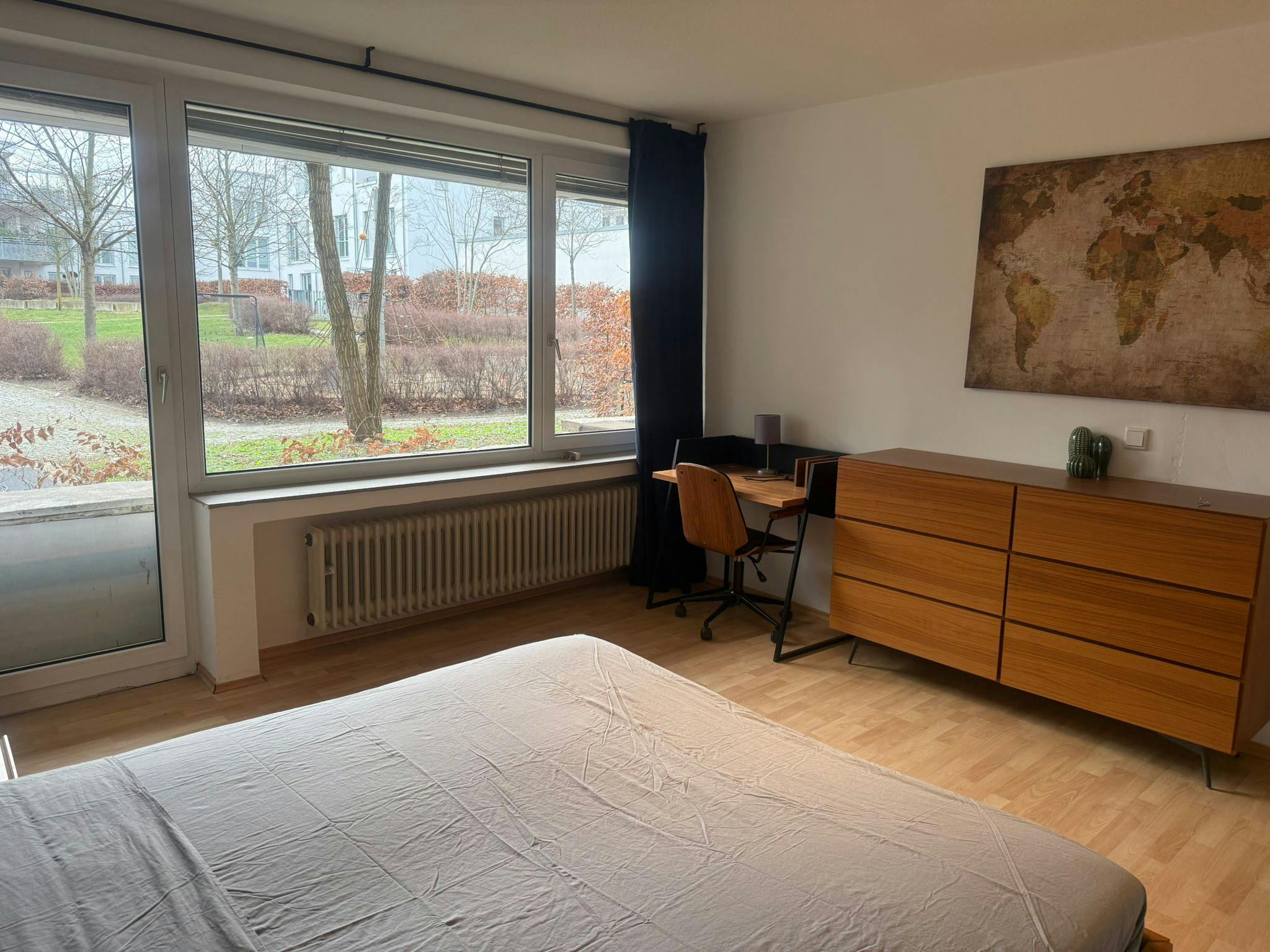 Each bedroom is spacious and well-lit, designed in a clean and modern style with warm wooden flooring and neutral tones throughout. It features a comfortable double bed with gray bedding and an upholstered headboard, a practical desk with a chair ideal for work or study, and a cozy sofa for relaxing. Large windows allow plenty of natural light and are complemented by dark curtains for privacy. The room offers generous storage with an open wardrobe, shelving, and drawers, while tasteful wall art and soft lighting add a welcoming and contemporary atmosphere. The compact bathroom offers a bathtub with shower, sink and toilet.