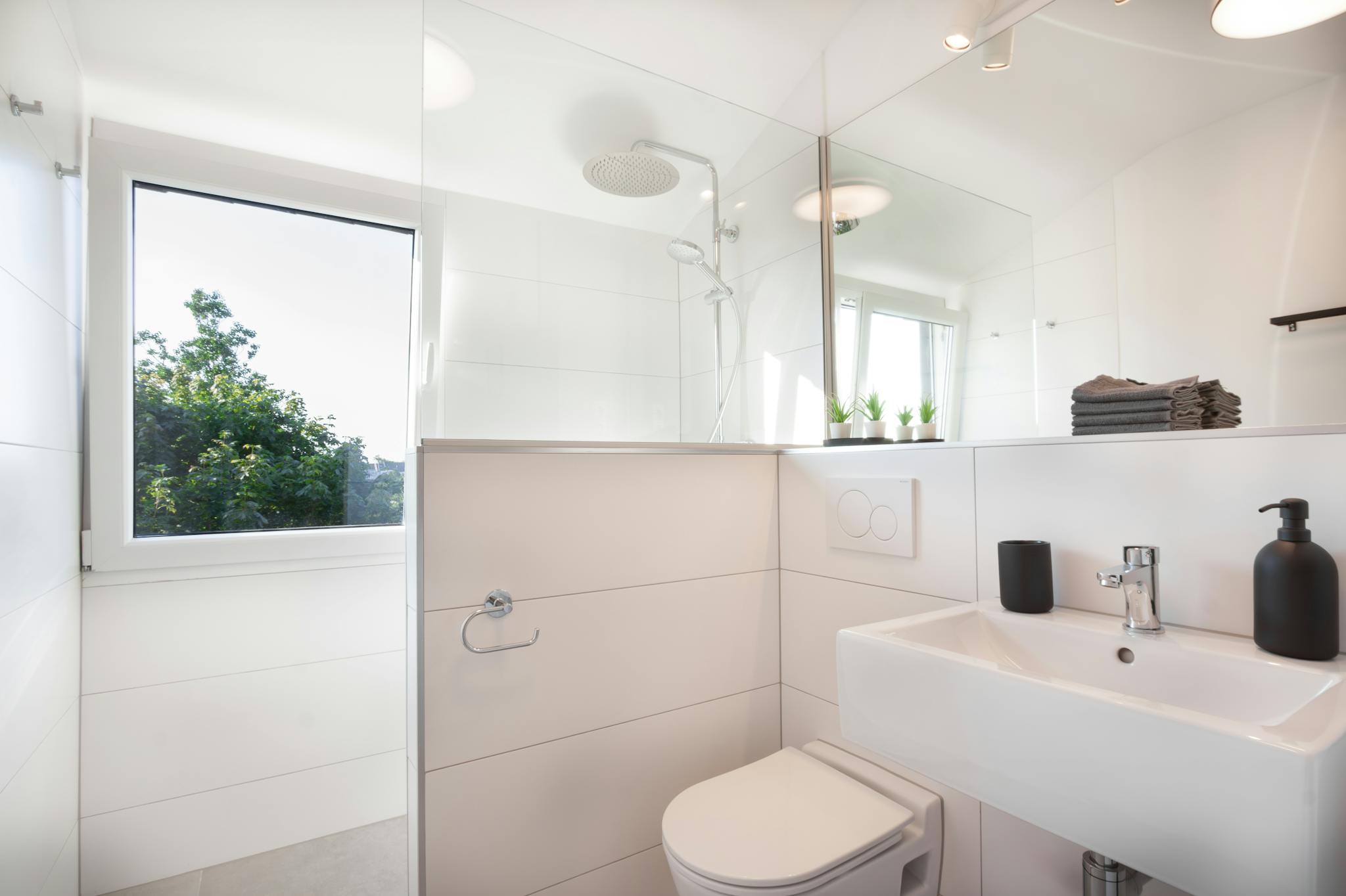 Das Tageslichtbad mit begehbarer Dusche ist mit einer Waschmaschine und einem Trockner ausgestattet.