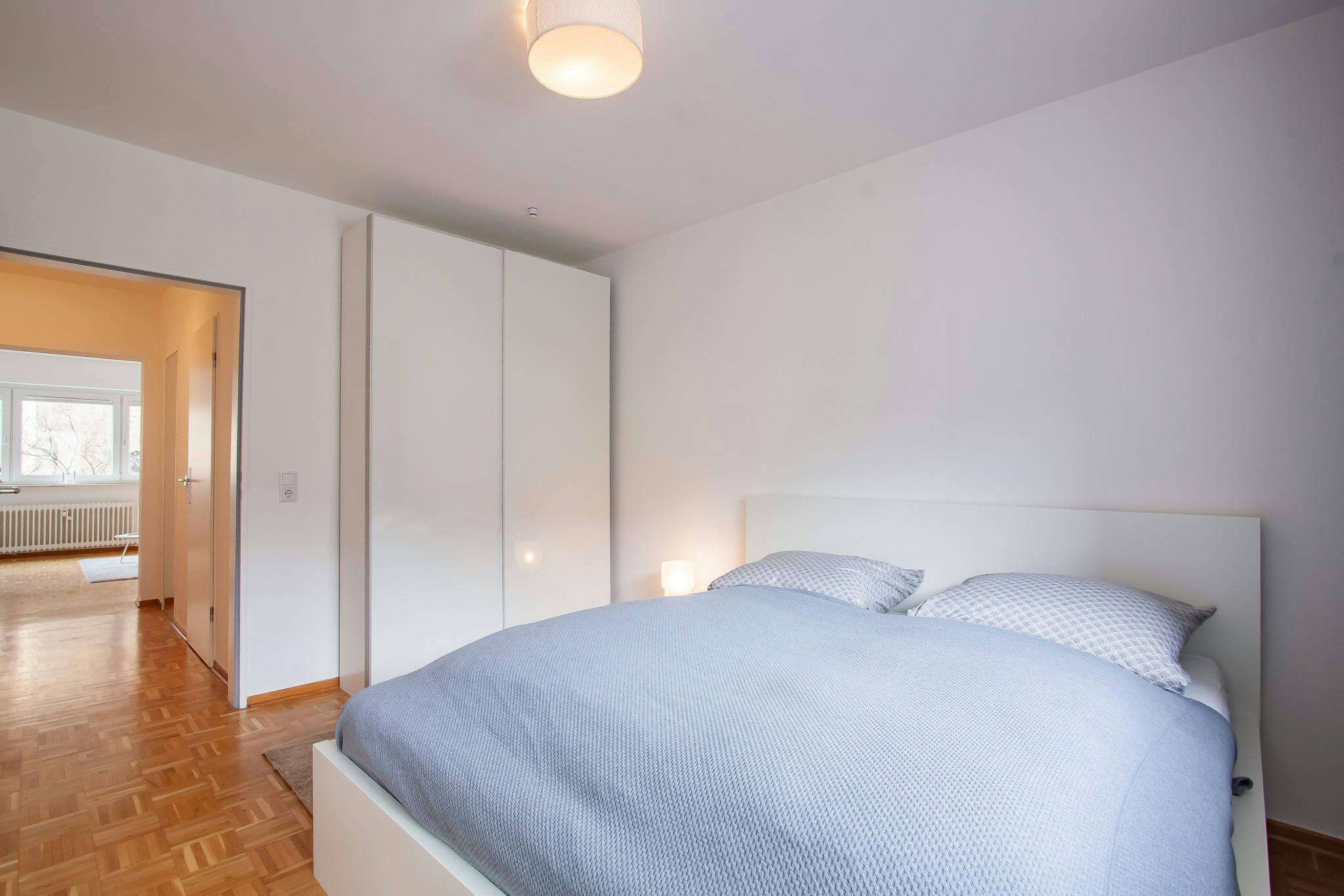 Über die Diele gelangt man in das Schlafzimmer, welches ist mit einem großen Kleiderschrank, einem Bett (180cm x 200cm), einem Beistelltisch. Moderne Wohnaccessoires verleihen jedem Zimmer einen besonderen Wohlfühlcharakter.