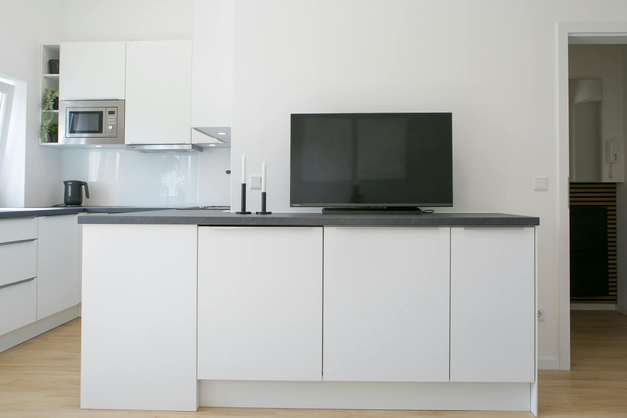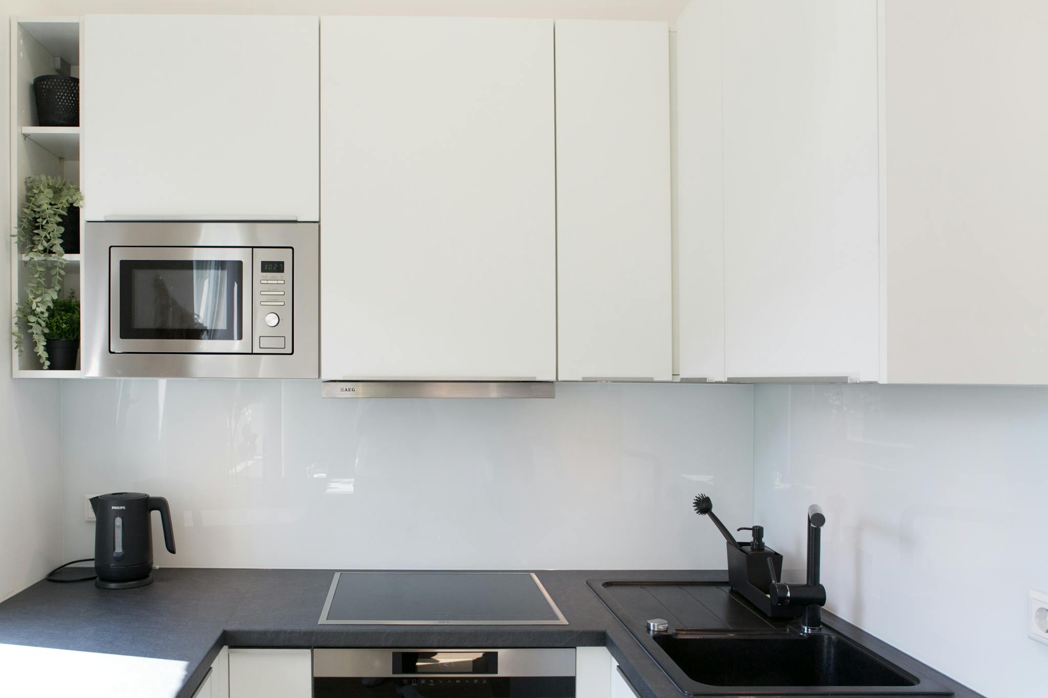 • Moderne Einbauküche, komplett ausgestattet (inklusive Spülmaschine, Backofen, Induktionsherd, Mikrowelle, Kaffeemaschine und Wasserkocher)