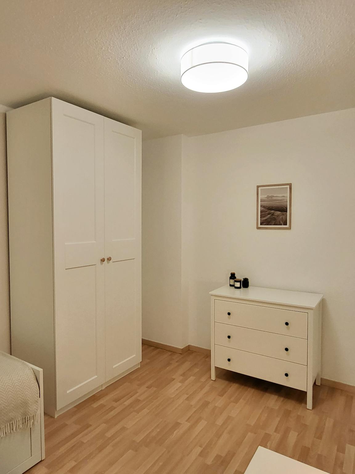 The WG room includes a bed (can be converted into a double bed; including two mattresses and bedding), a bedside table, desk and chair, wardrobe and mirror, chest of drawers, etc. (see photos).