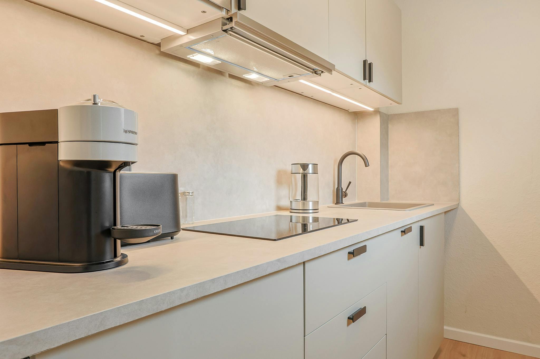 Gegenüber des Esstisches gelangt man in die komplett ausgestattete und moderne Küche. Neben einer Nespresso Kaffeemaschine befindet sich auch eine Spülmaschine und eine Mikrowelle mit Backofenfunktion in der Küchenzeile.