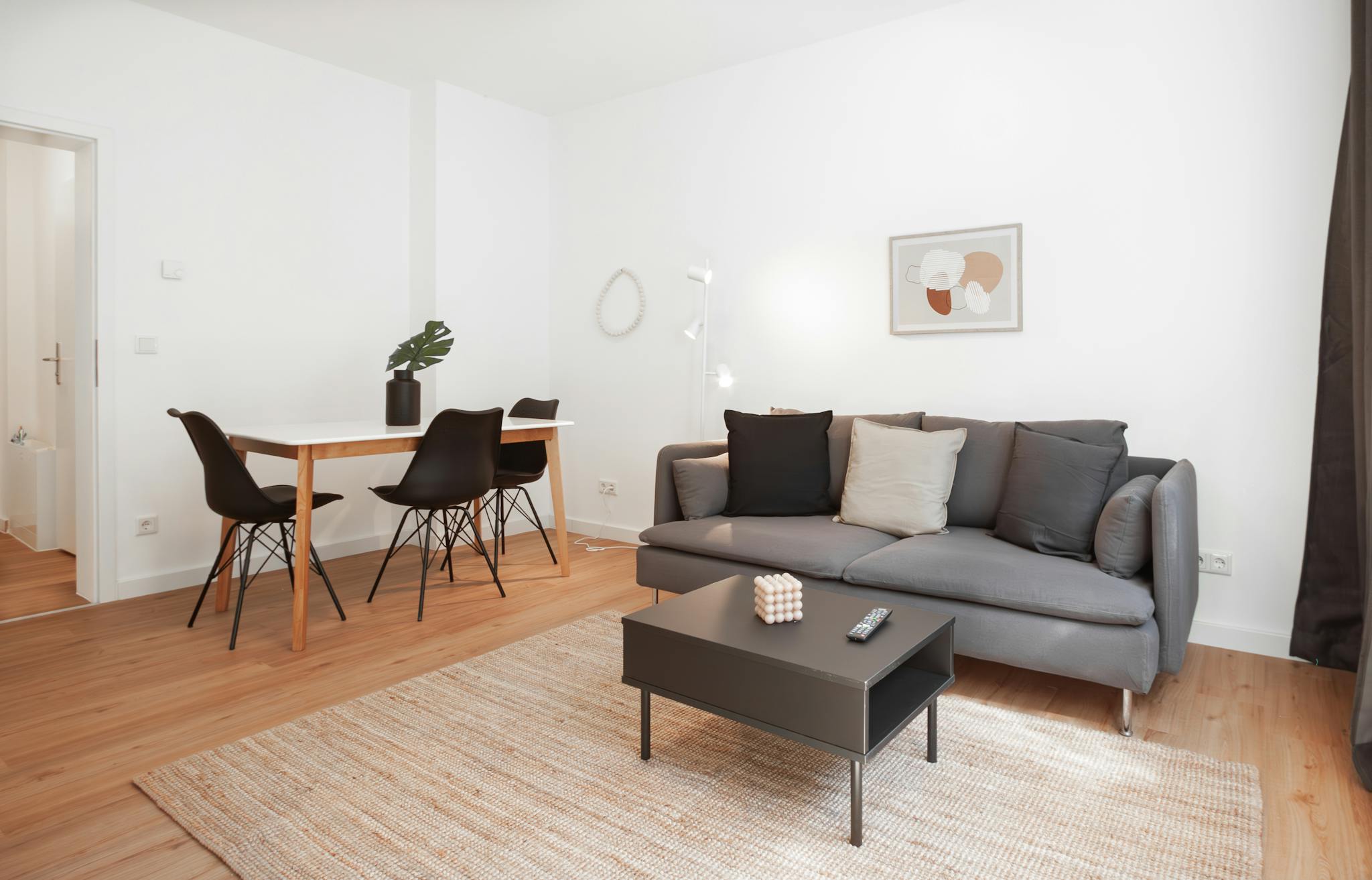 Das Wohnzimmer überzeugt mit einer gemütlichen Couch, einem Tisch mit 3 Stühlen.
