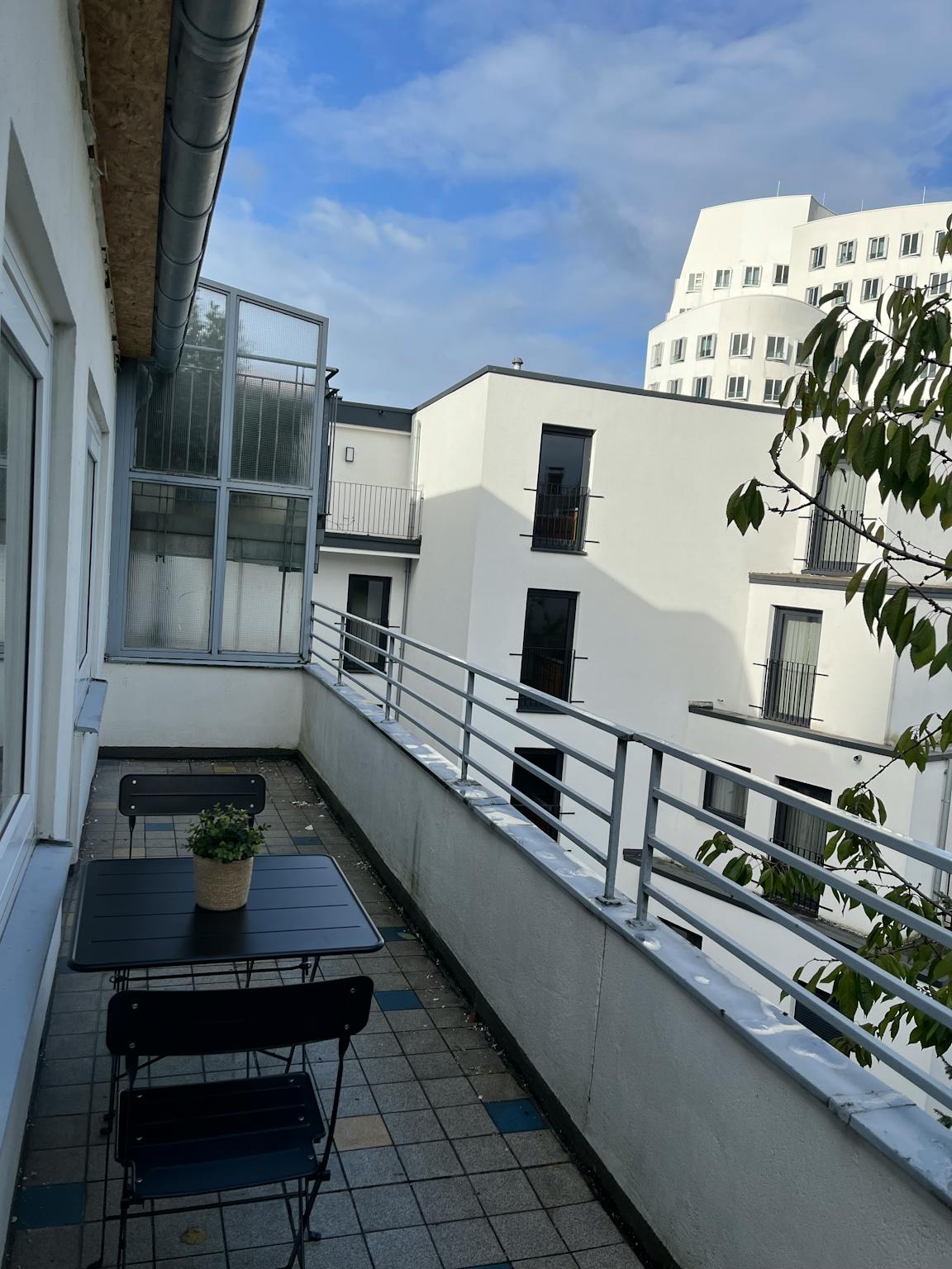 Der große Balkon mit Blick auf die Gehry Bauten und dem Hafen lädt zum verweilen ein.