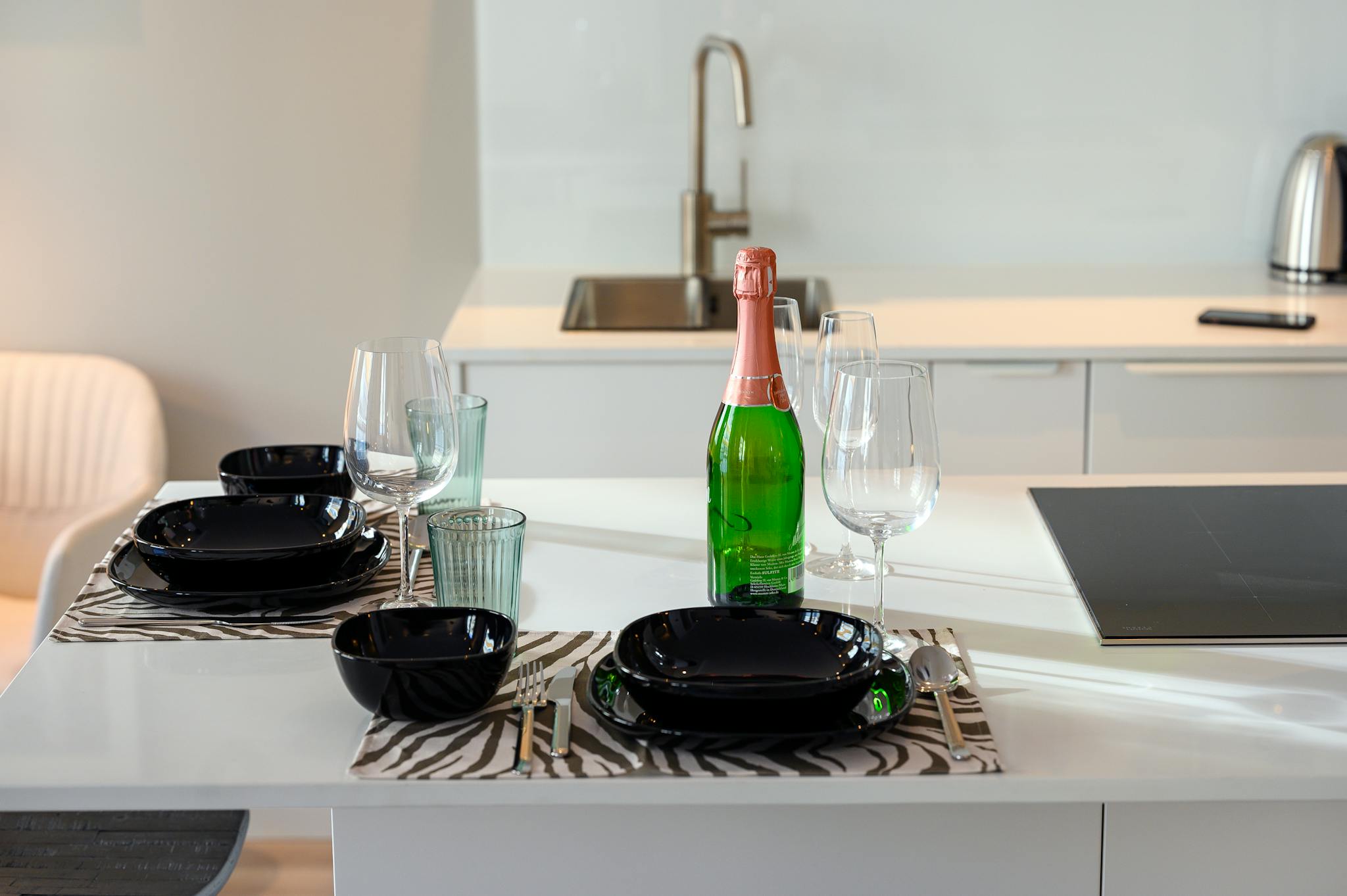 High-quality brand appliances oven-microwave, large fridge with 4-star freezer compartment, full-size dishwasher, 4-zone induction hob, designer extractor bonnet, Nespresso machine, milk jug and frother, stainless steel kettle, toaster, smoothie maker, kitchen scales, Induction-capable stainless steel cooking set, 4x each sparkling wine, white wine and red wine glasses, water glasses, 4x complete crockery with espresso cups, 28-piece cutlery set, lemon squeezer, bottle opener/corkscrew, champagne bottle stopper, cooking utensils including knife set, etc. Nothing is missing!