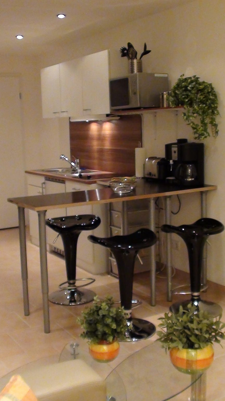 - Pantry kitchen with microwave with grill function and electric stove including ceramic hob, dining counter with height-adjustable bar stools