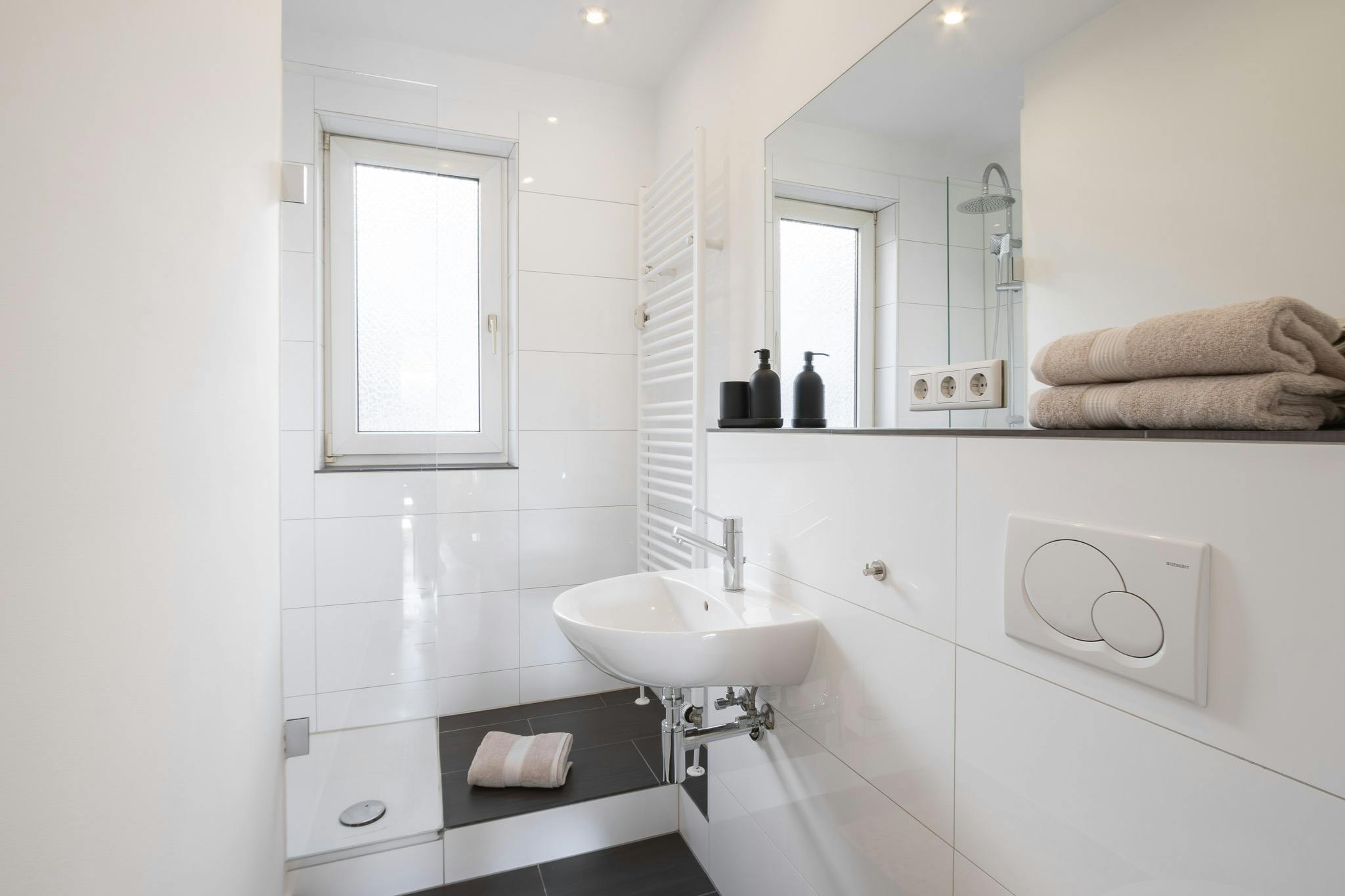 Im Tageslichtbad befindet sich neben WC und Waschbecken eine geräumige Dusche.