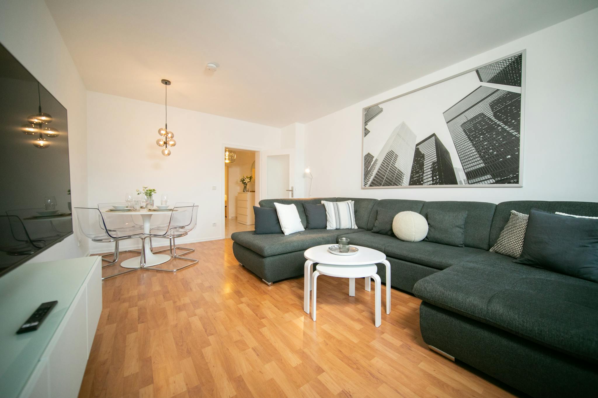 * Wohnbereich mit Sofa, Smart-TV, Esstisch & Stühlen