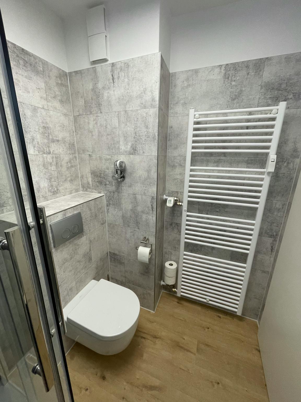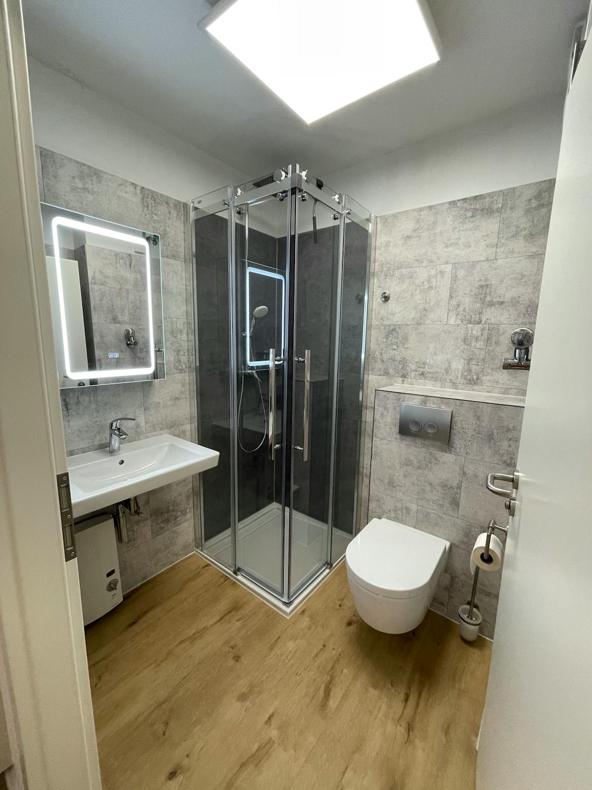 -DESIGNER Bad mit Spiegel, WC und Waschbecken und großer Regendusche