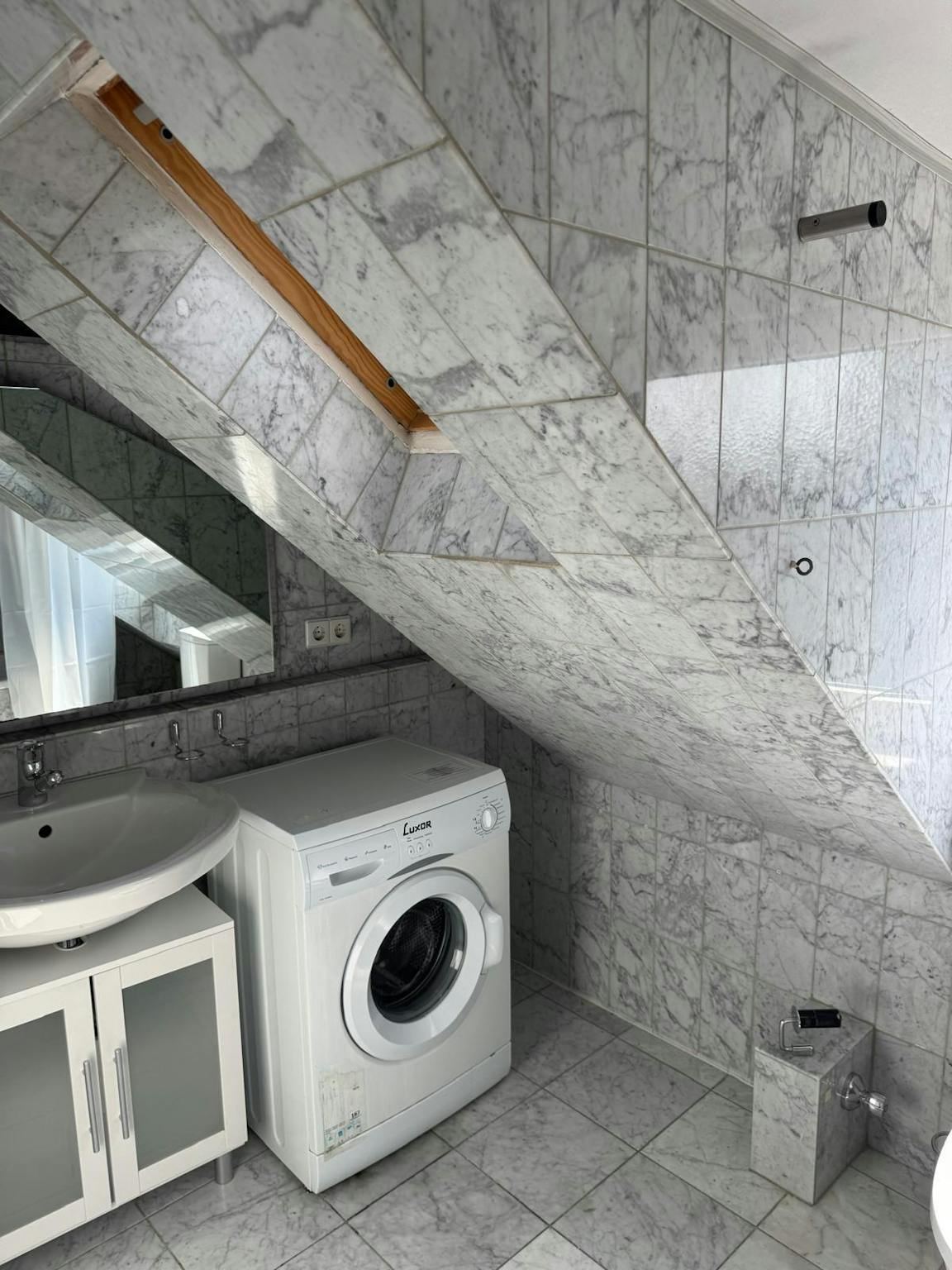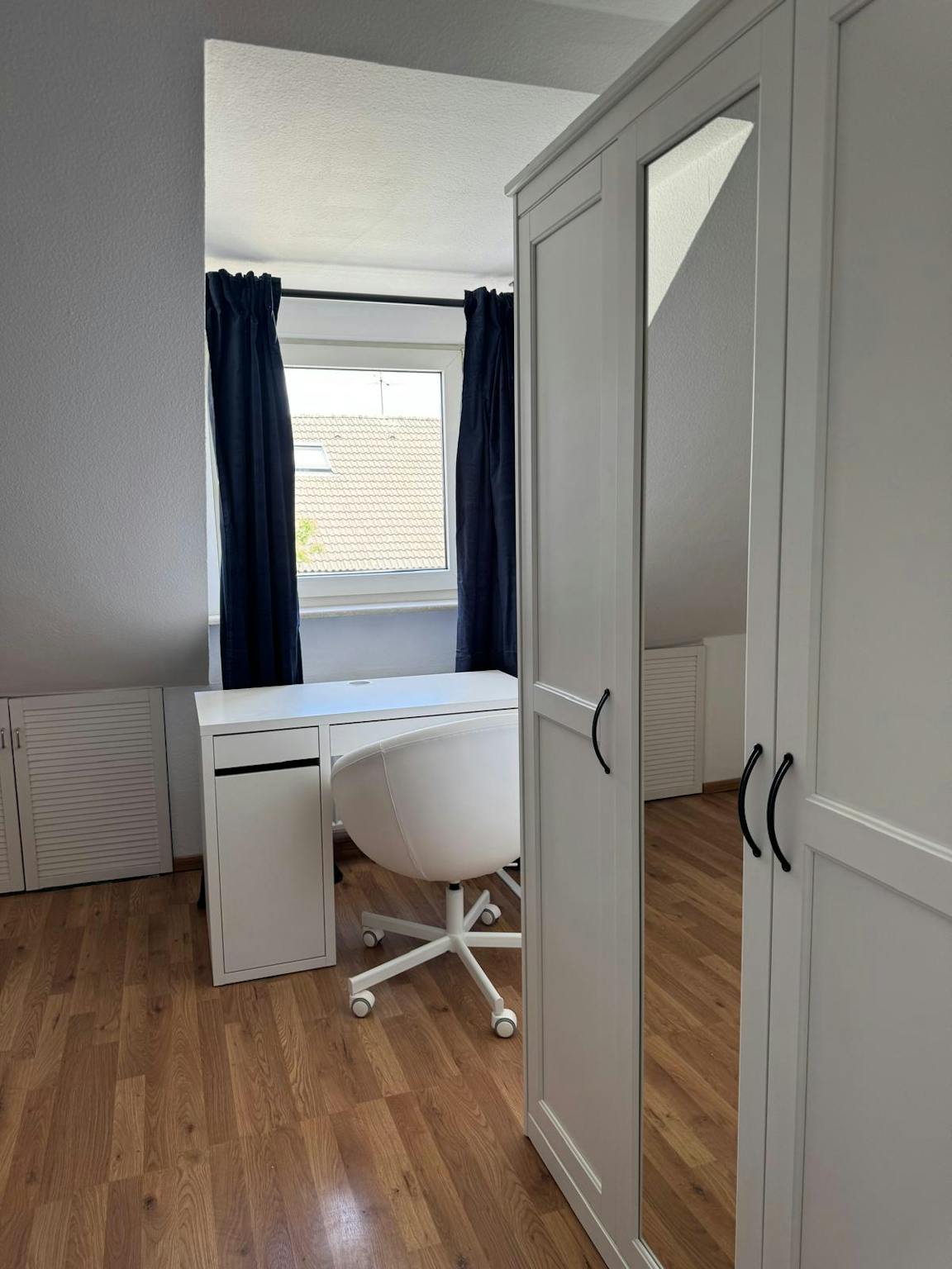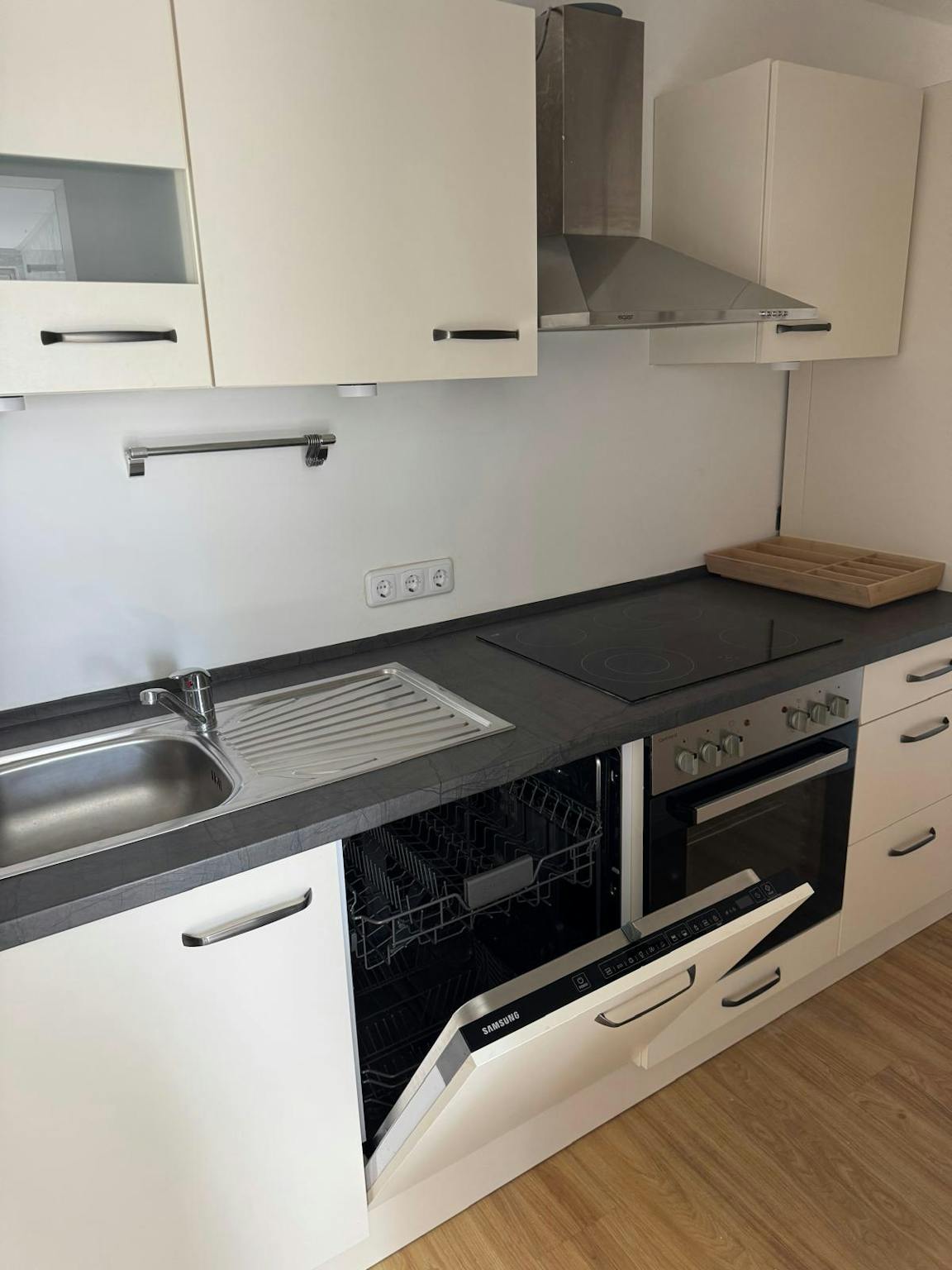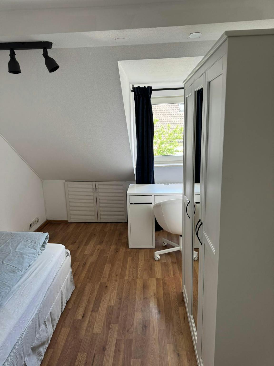 The bedroom has a comfortable bed with plush pillows, a work-friendly desk positioned near a window for natural light, and tasteful decor that creates a relaxed, homely vibe. You will also have access to the kitchen that features sleek white cabinetry, a full-size sink, and essential appliances including a stove and dishwasher. This functional kitchen has everything you need to feel right at home. Lastly, the bathroom is equipped with various fixtures including a washing machine, toilet, sink, and a bathtub shower. All in all, this apartment offers both charm and practicality for your stay in Düsseldorf.