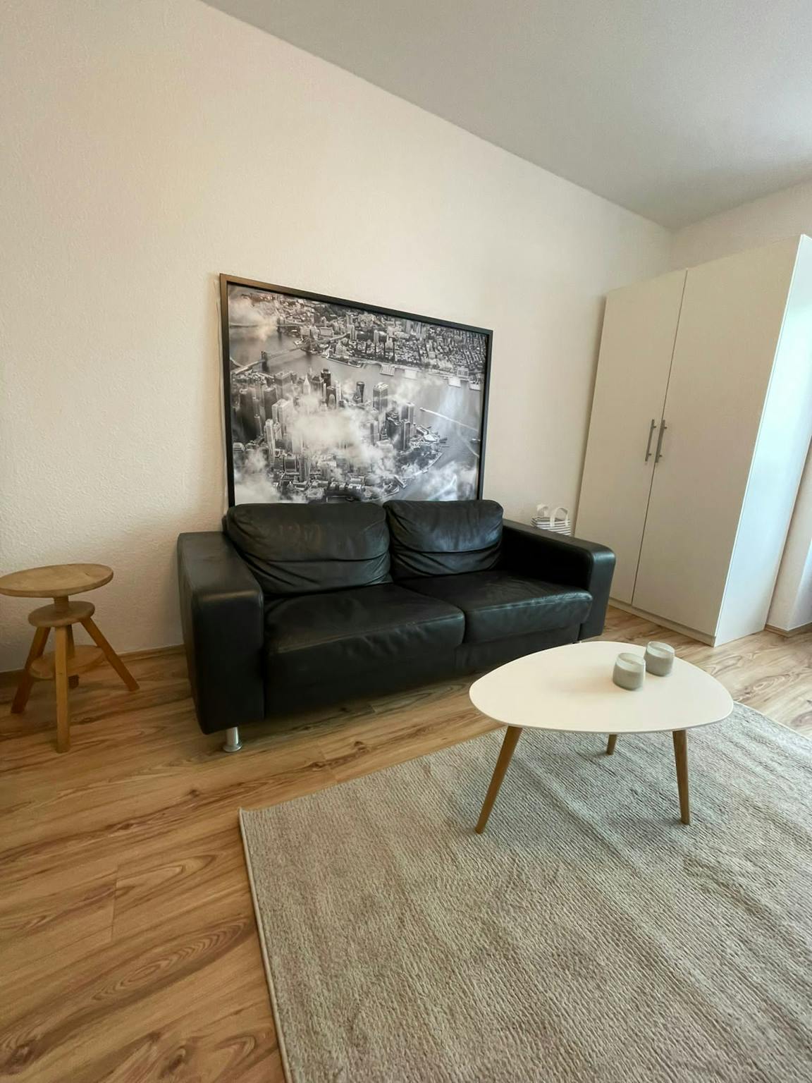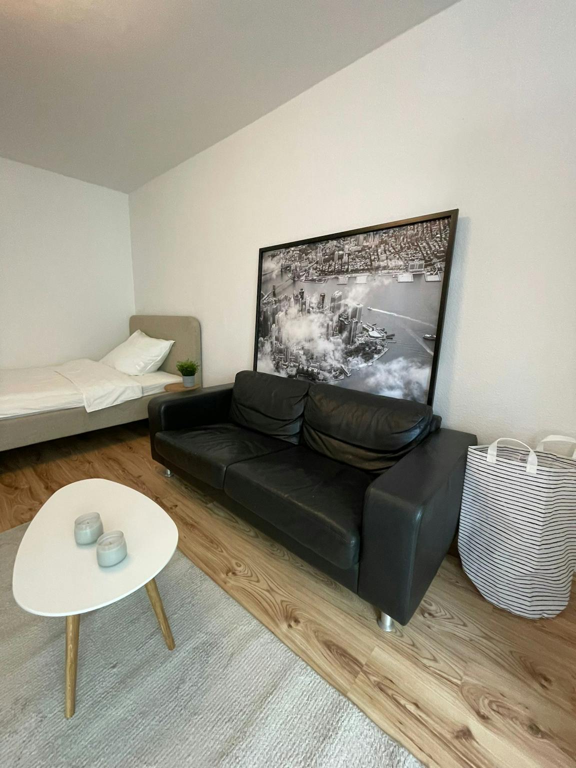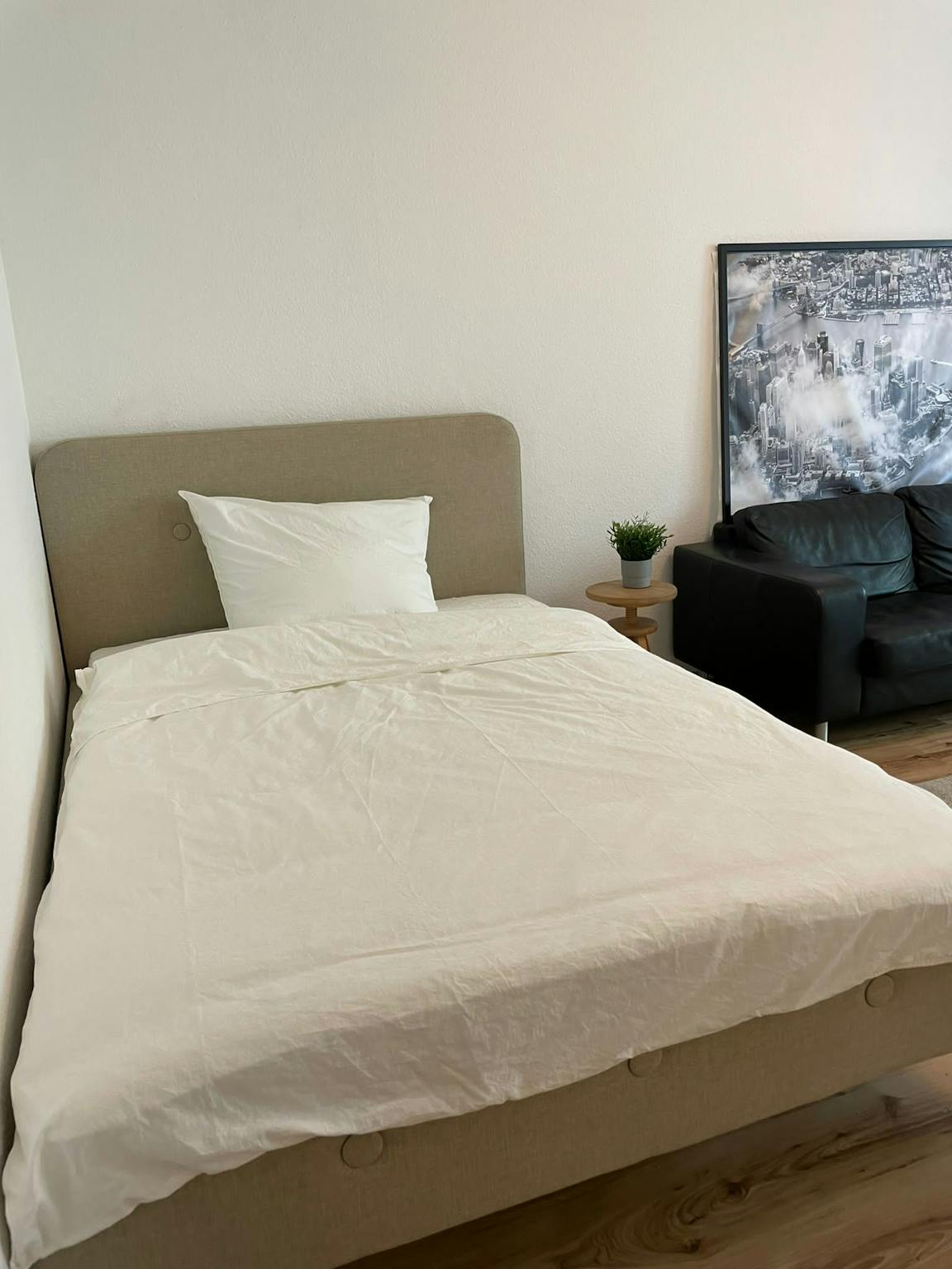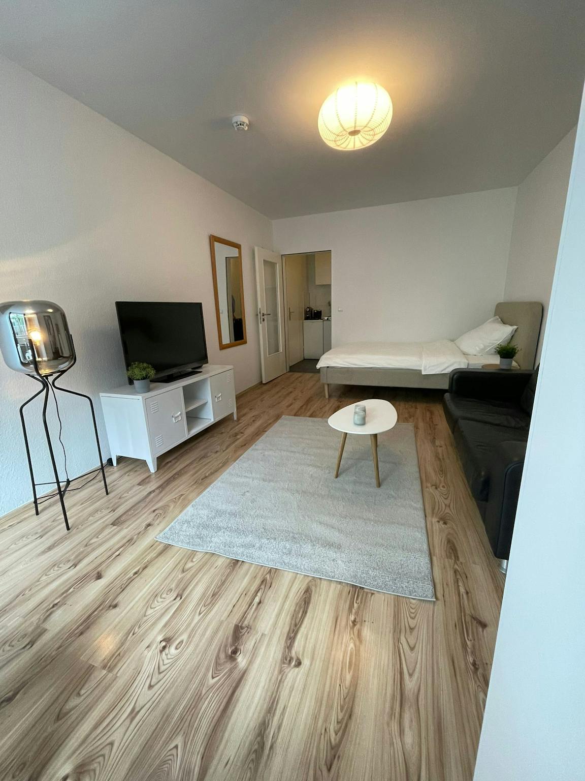 Helle, neu und vollständig eingerichtete 1-Zimmer-Wohnung in einem gepflegten Haus. Der gut geschnittene Grundriss bietet Platz für Bett, breite Couch und Esstisch. Eine praktische Kochnische ist integriert. Das moderne Bad ist komfortabel dimensioniert. Dank der Ausstattung eignet sich die Wohnung für kurz- und langfristige Mietzeiträume.
