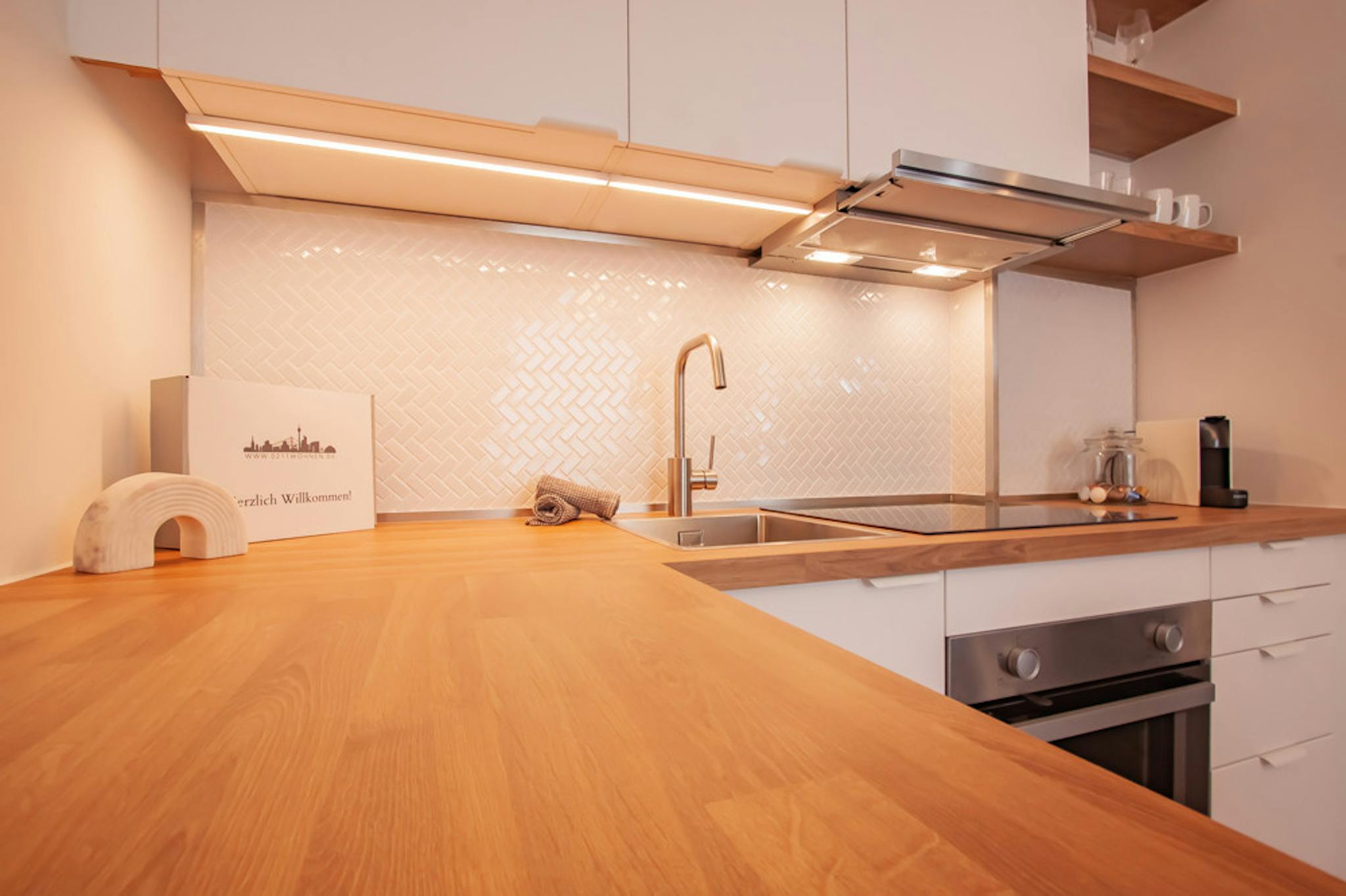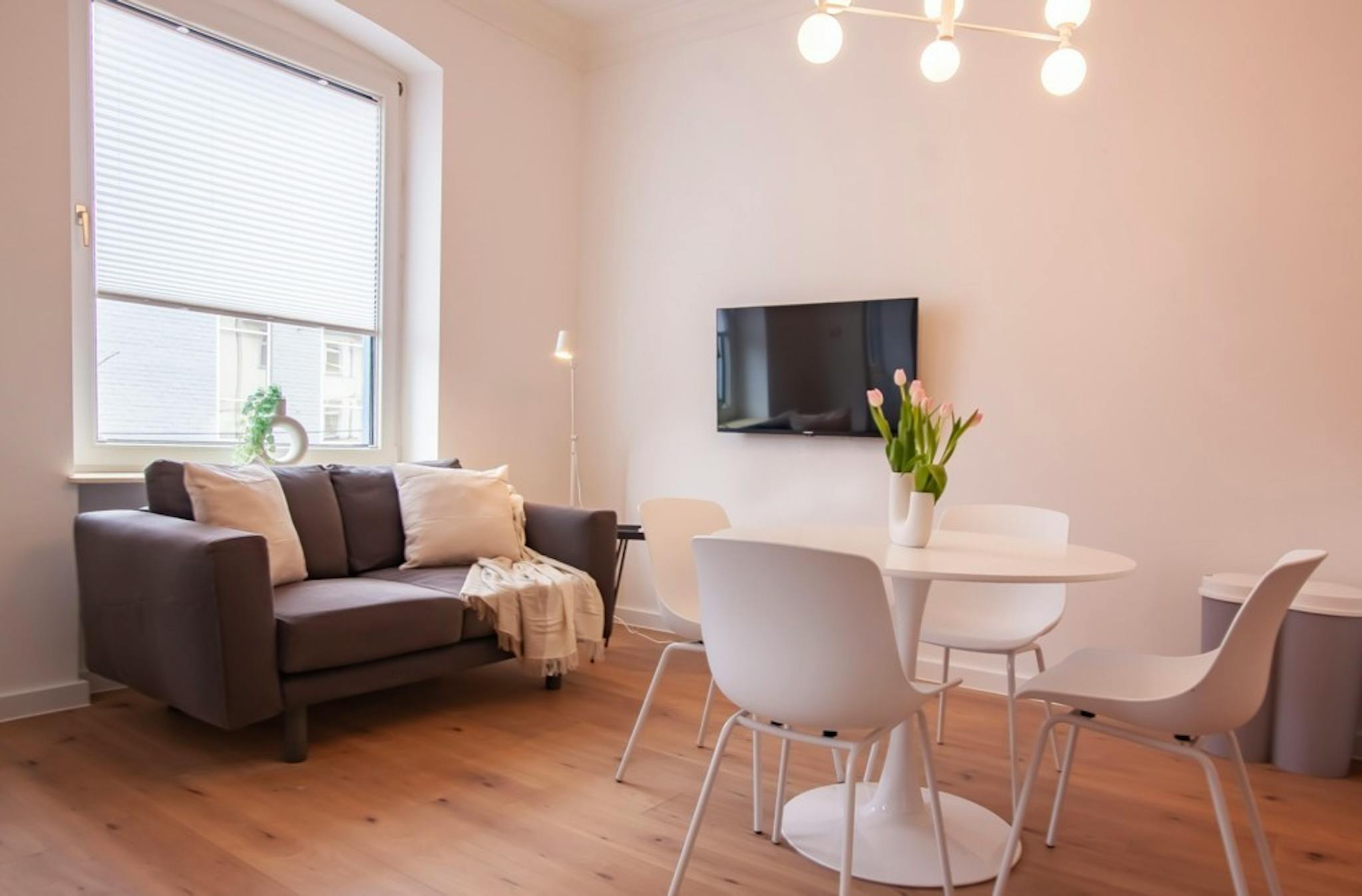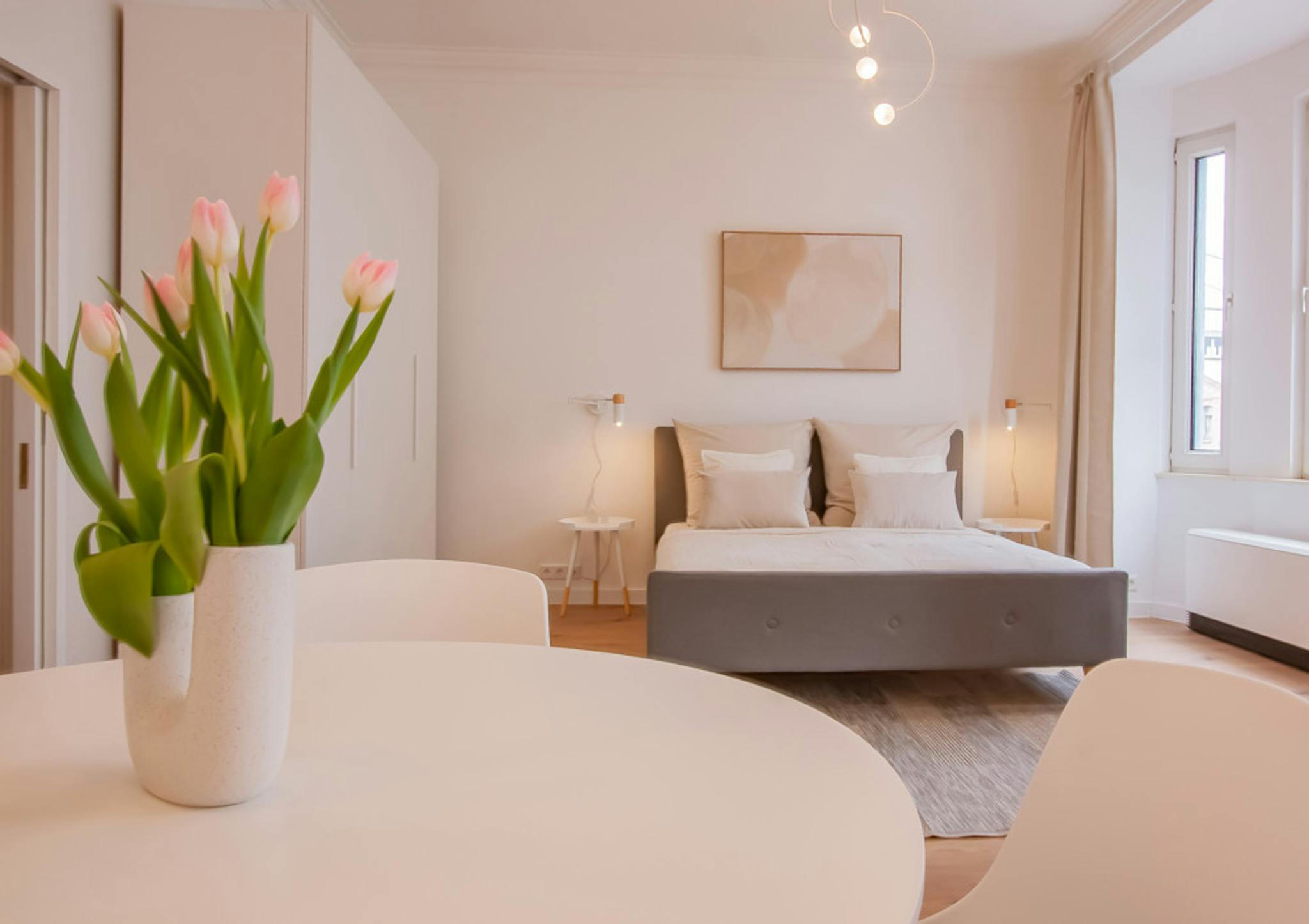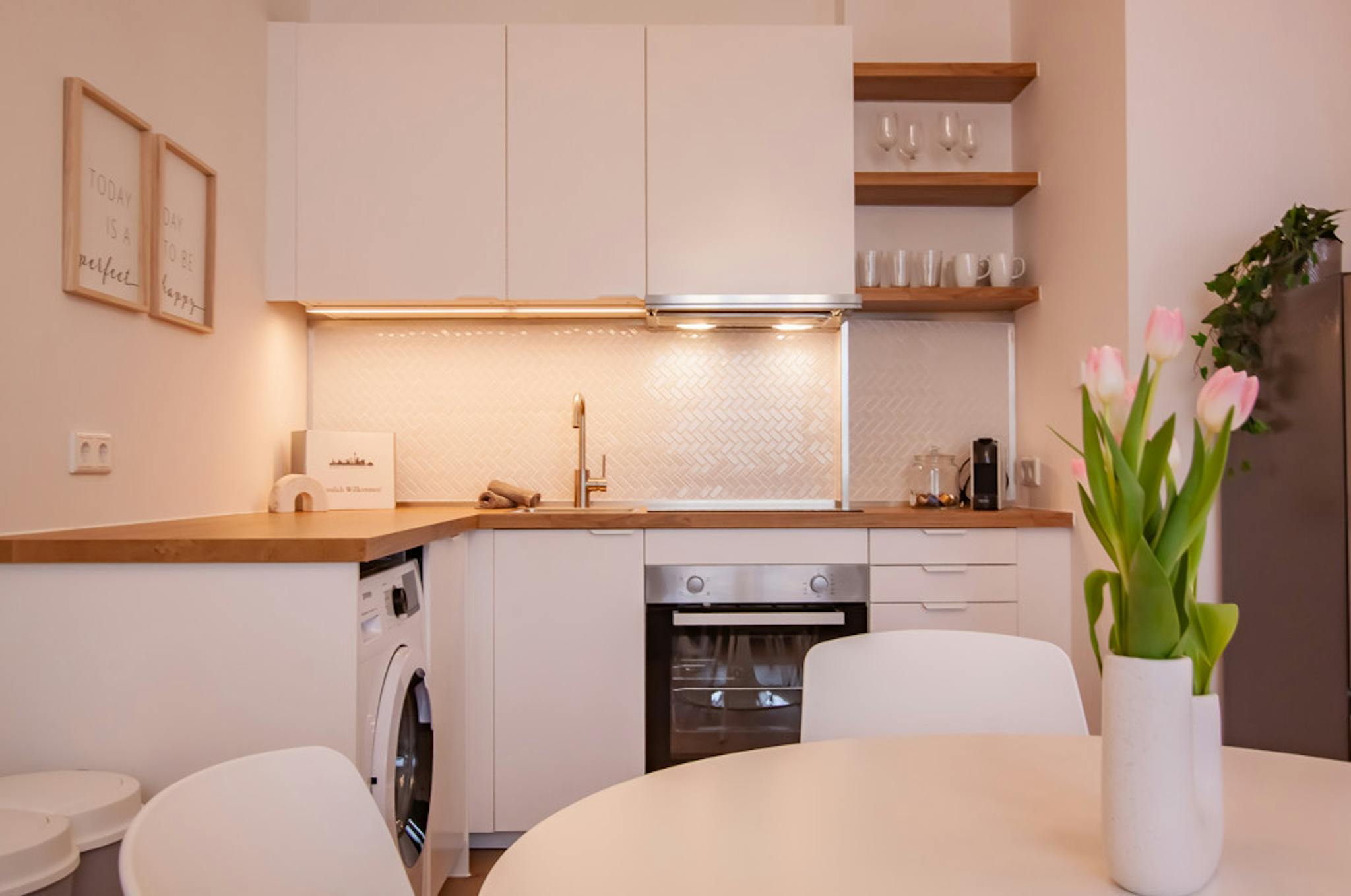 Non-SmokingNot allowedOur fully equipped apartment provides you with all the amenities for your daily needs. The kitchen comes with all the cooking utensils and includes an oven, a ceramic stovetop, an extractor hood, a toaster, and a coffee machine. The bathroom tastefully combines classic elements with modern design. In the living and sleeping area, you'll find a spacious built-in wardrobe, a comfortable double bed (140cm x 200cm), and a dining table that can also serve as a workspace. Additionally, the apartment features a cozy couch and a Smart TV for your entertainment. Furnished with modern home accessories, our apartment offers a particularly inviting ambiance.