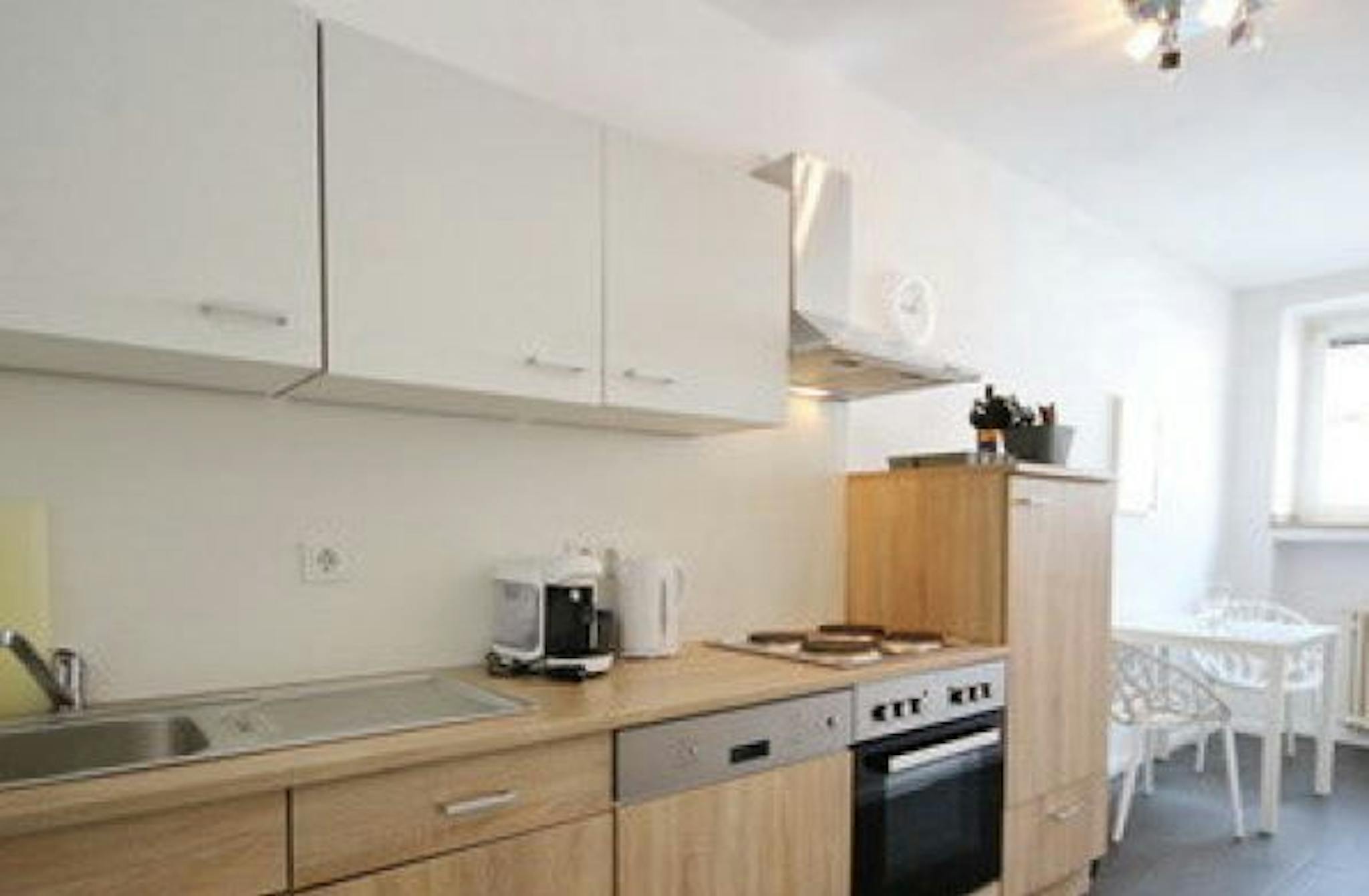 The kitchen is equipped with everything needed for everyday living. A dryer and a washing machine are available in the basement and are shared with other tenants.