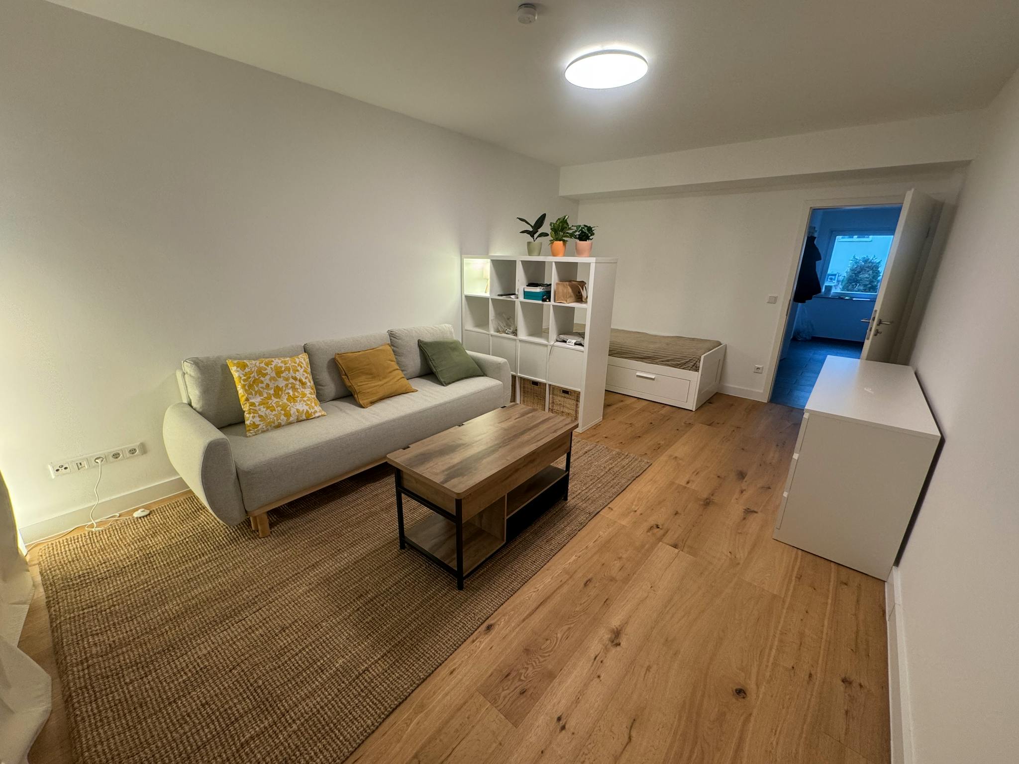 • Smart Layout: A clever room-divider shelf separates the cozy sleeping nook (featuring a storage-integrated bed) from the bright living area.