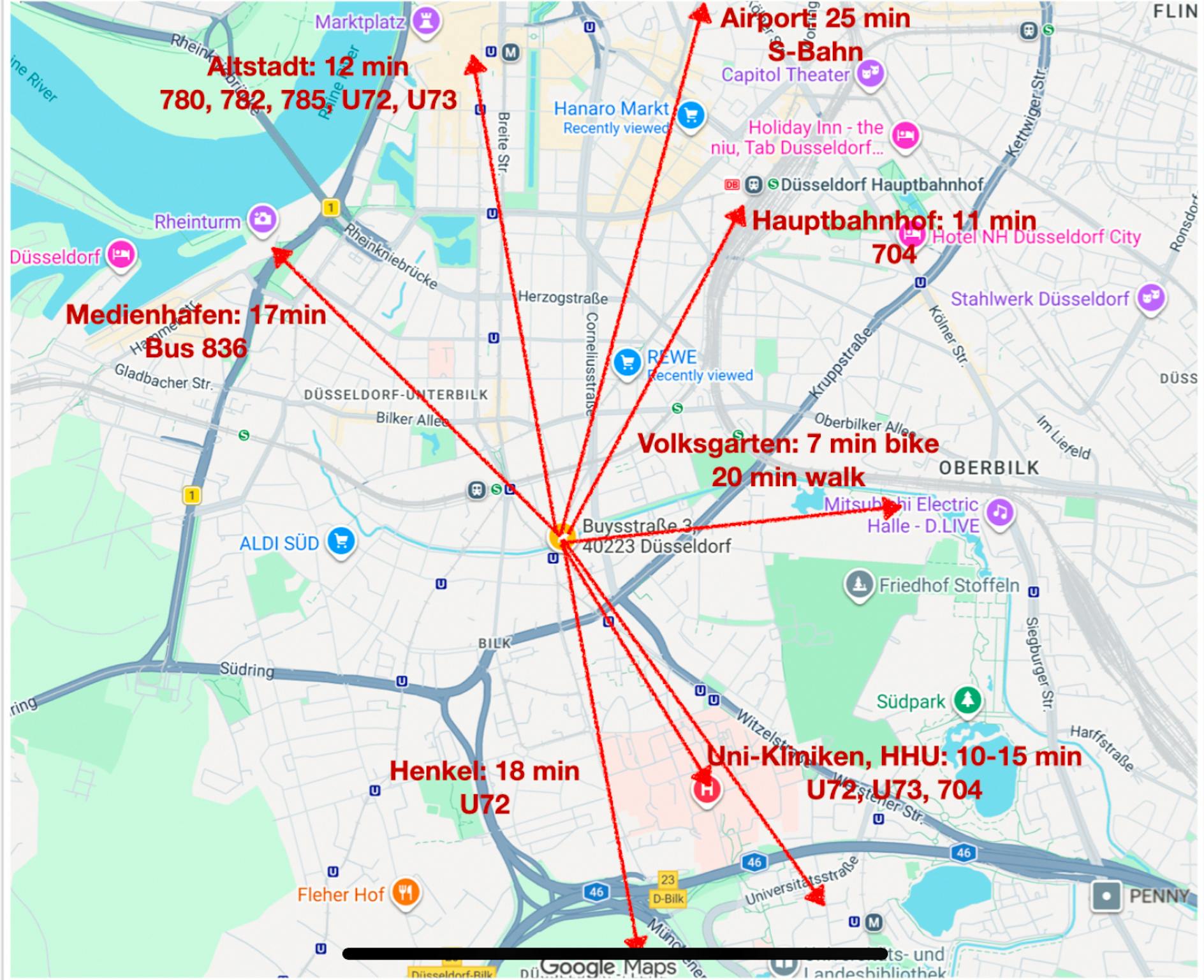 • University (HHU) & Clinics: Only 10–15 minutes via lines U72, U73, or 704.