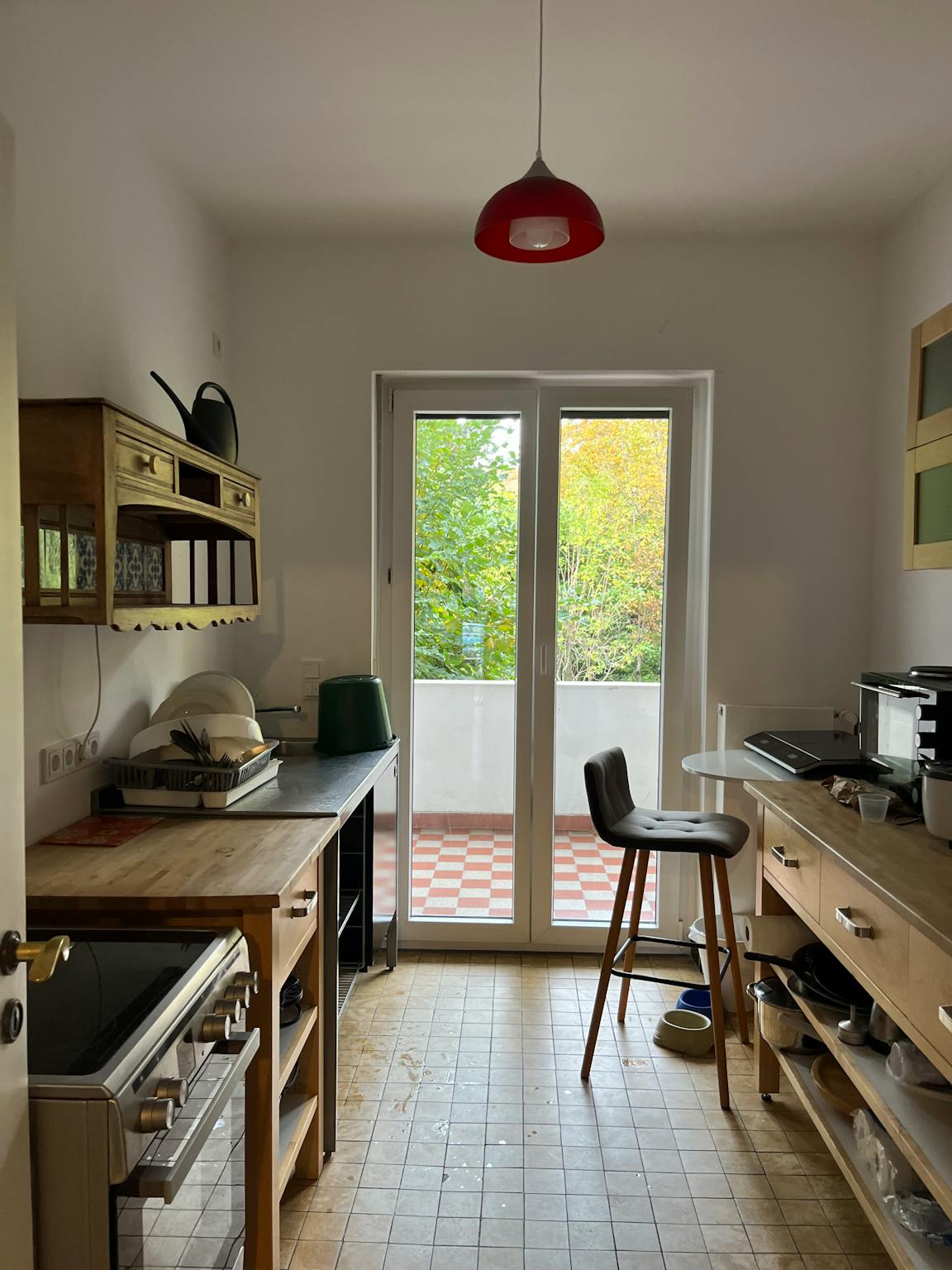 Eingerichtete Küche mit direktem Zugang zu einer großen Terrasse und Blick in den Garten.