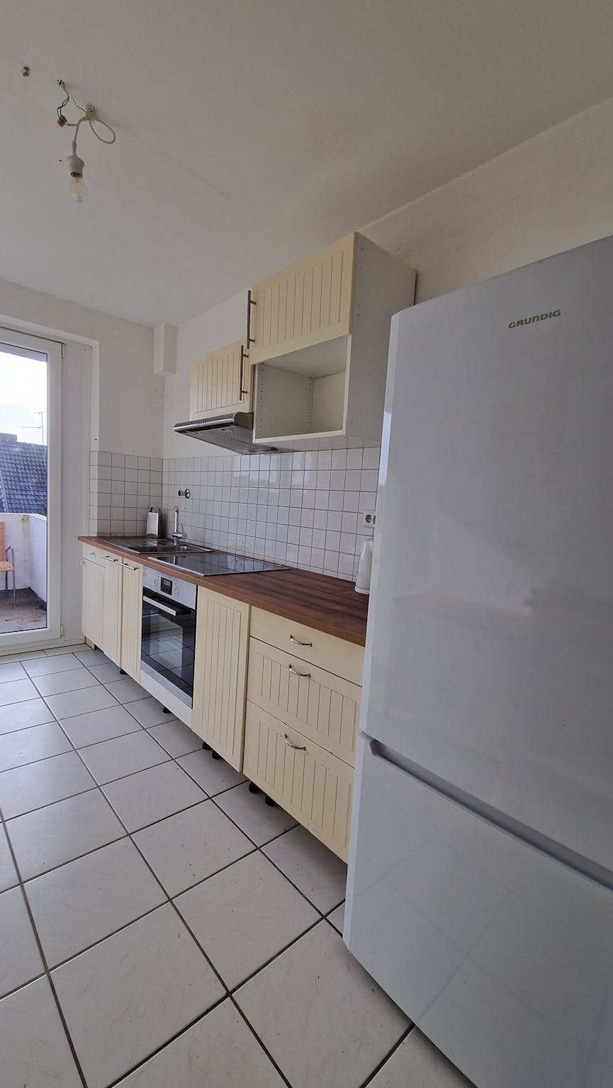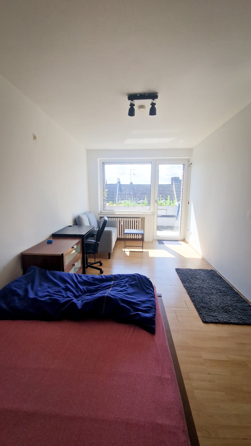 Enjoy a large, bright private room in a well-maintained 4-shared apartment(2-3 Flatmates) on Volmerswerther Straße, Düsseldorf-Unterbilk. The room offers plenty of space, including a cozy sofa sitting area and direct access to a balcony – perfect for relaxing after work or study.