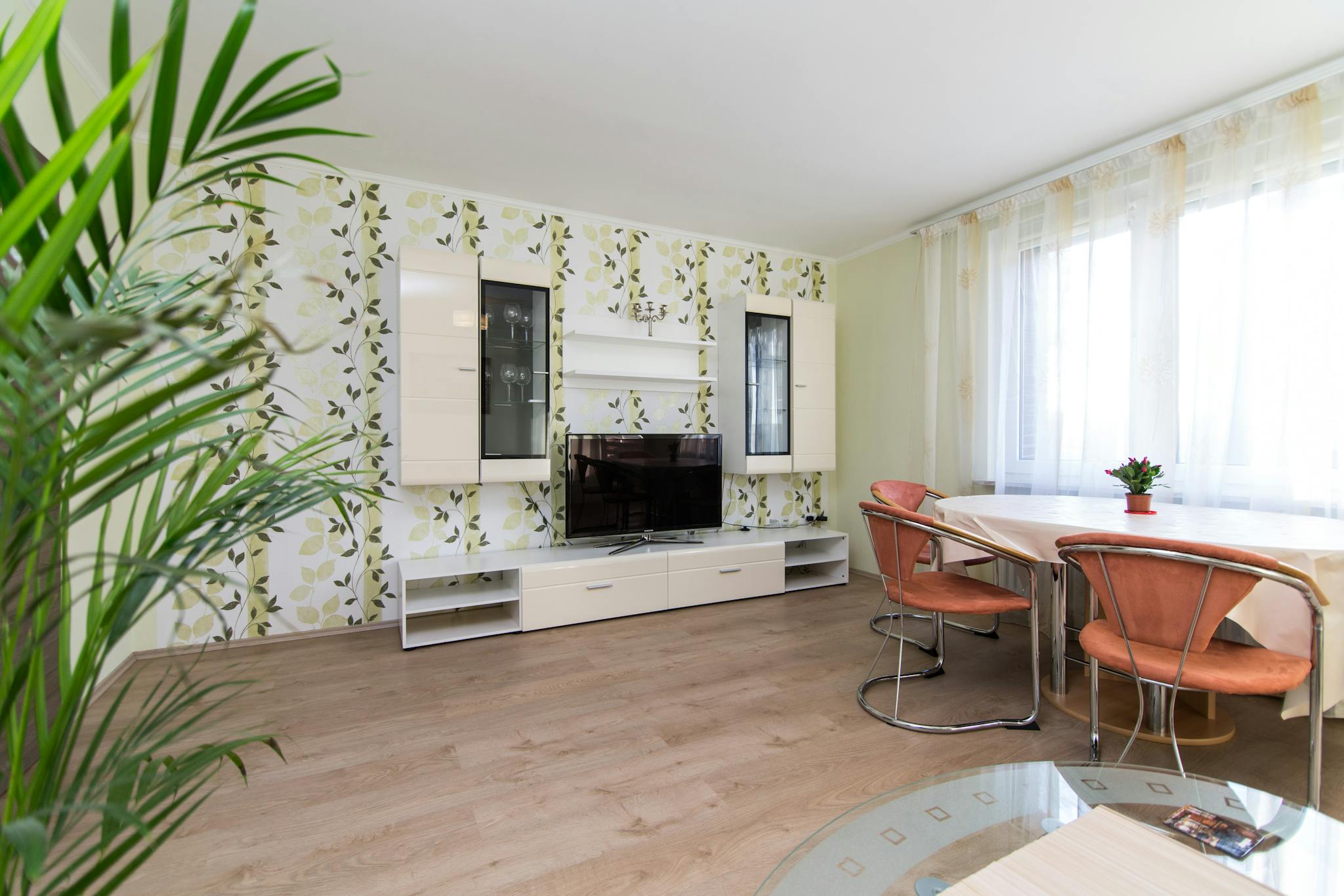 The working / bed room has a single bed(100X200) , work desk and (hidden) the living room there is: a sofa bed, with sleep function (1,40X200) a large 46 inch 3D LED TV, a table for 6 people and a glossy white modern wall unit , on request we can provide a single bed in this room. The spacious bathroom is equipped with window, tub, hair (hidden) the kitchen there is a high table with 2 high chairs, washing machine with dryer and dishwasher. You can also use a kettle, coffee maker, induction cooker, fridge-freezer, microwave, pots, pans, kitchen utensils. Also provided pillows, blankets, bed linen , towels. There is free high speed WLAN. Using the internet for any illegal purposes is prohibited.A cleaning can be booked on request at an additional cost.
