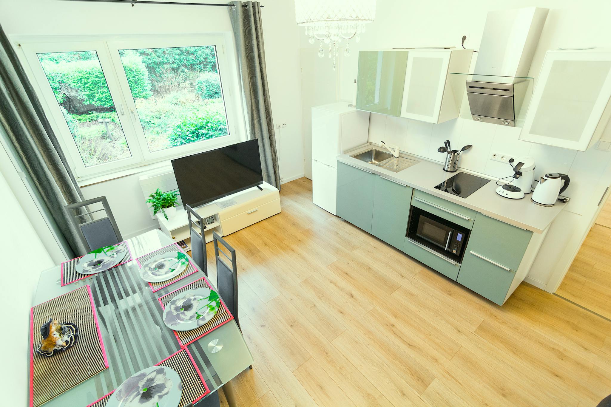 In the living room-studio, there are a bed, a large 48-inch LED TV, a glass table for 6 persons, as well as a gleaming olive modern kitchen.