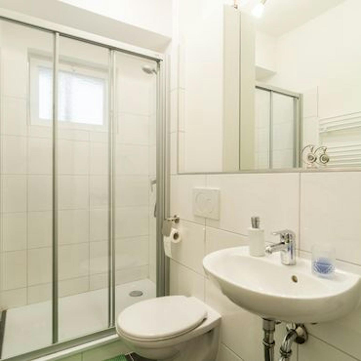 Das moderne, geräumige Badezimmer ist mit einem Fenster, einer Dusche, einem Haartrockner, Shampoo und Seife ausgestattet.
