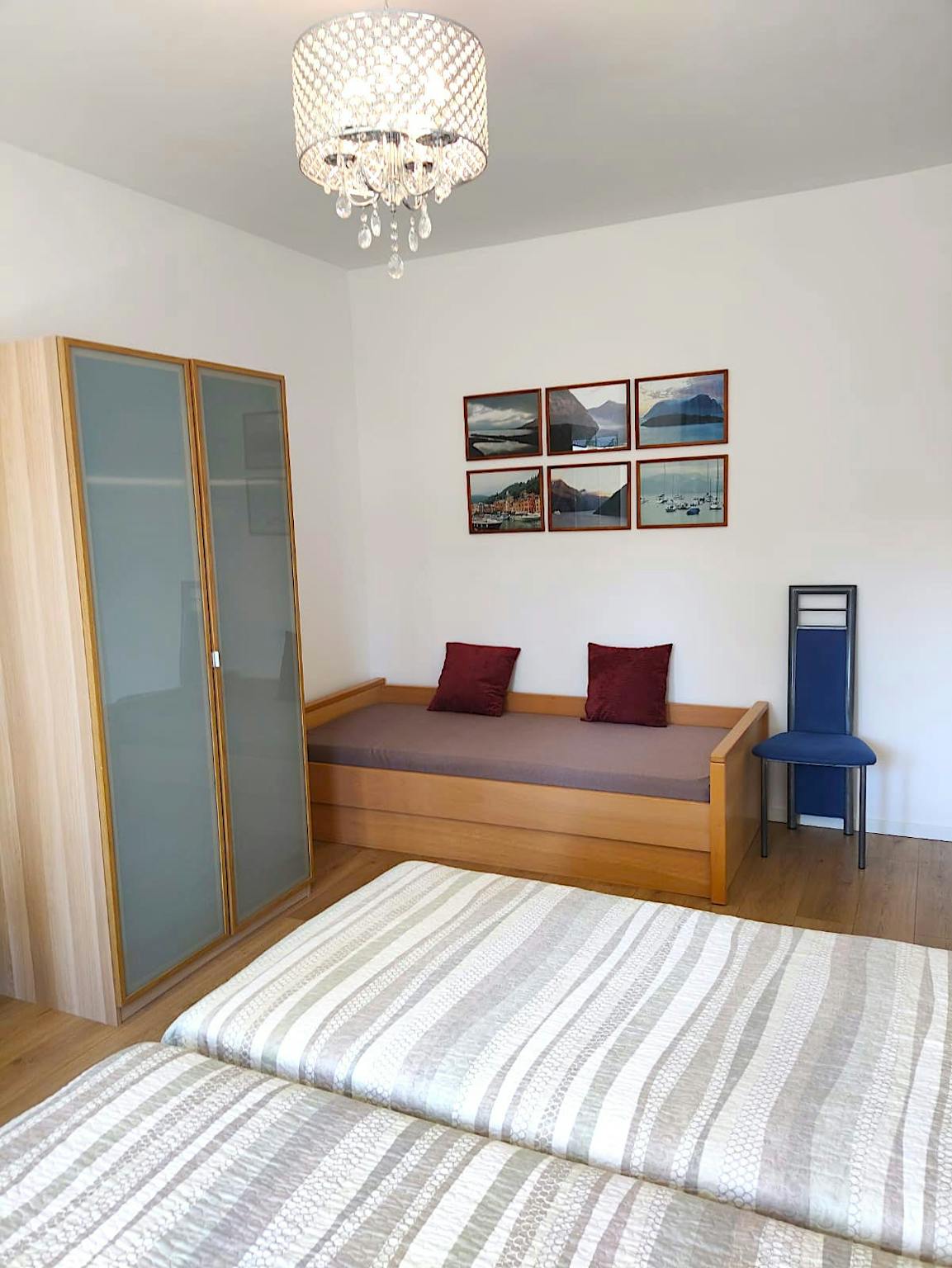 Die Wohnung verfügt über ein Schlafzimmer mit drei Einzelbetten, einen Schrank und einen Tisch mit 2 Stühlen.