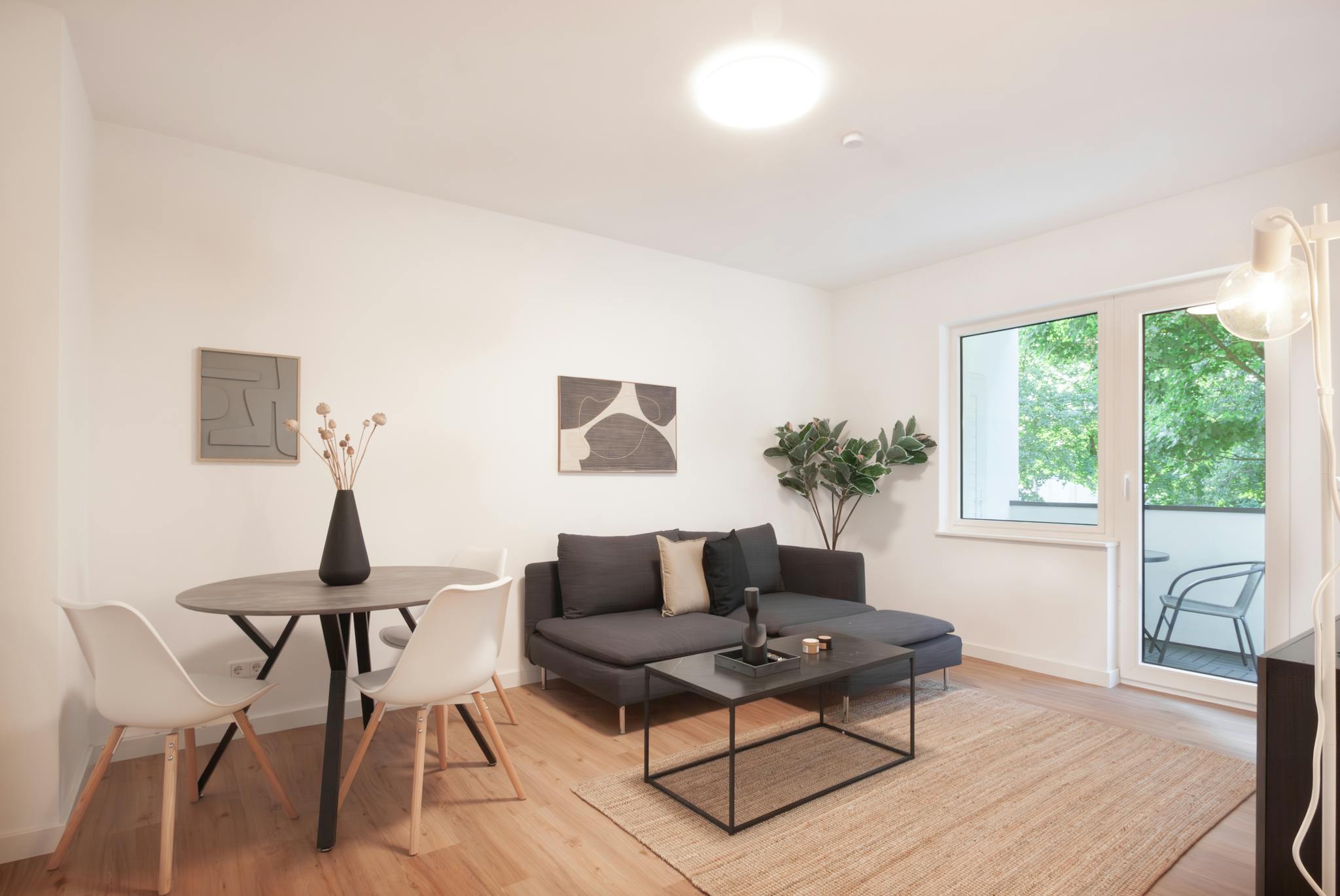 Das Wohnzimmer überzeugt mit einer gemütlichen Couch, einem runden Tisch mit 4 Stühlen und dem Zugang zum Balkon.