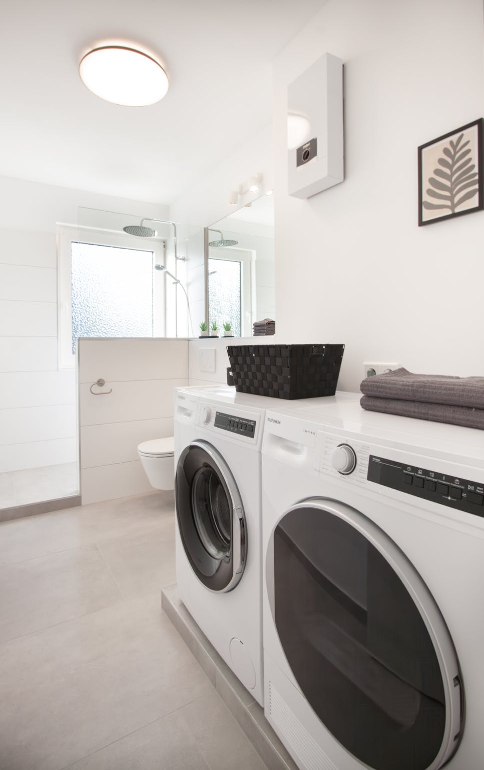 Das Tageslichtbad mit begehbarer Dusche ist mit einer Waschmaschine und einem Trockner ausgestattet.