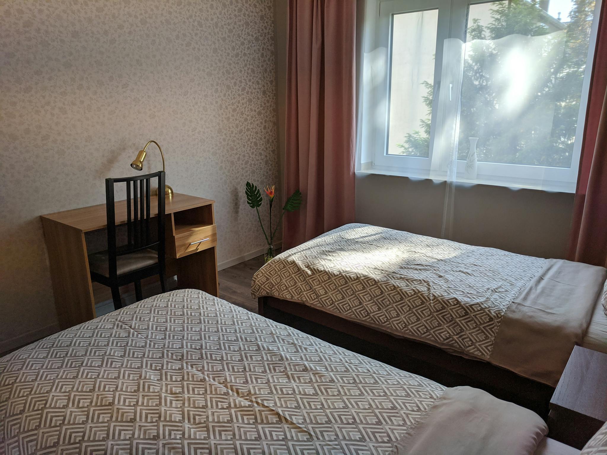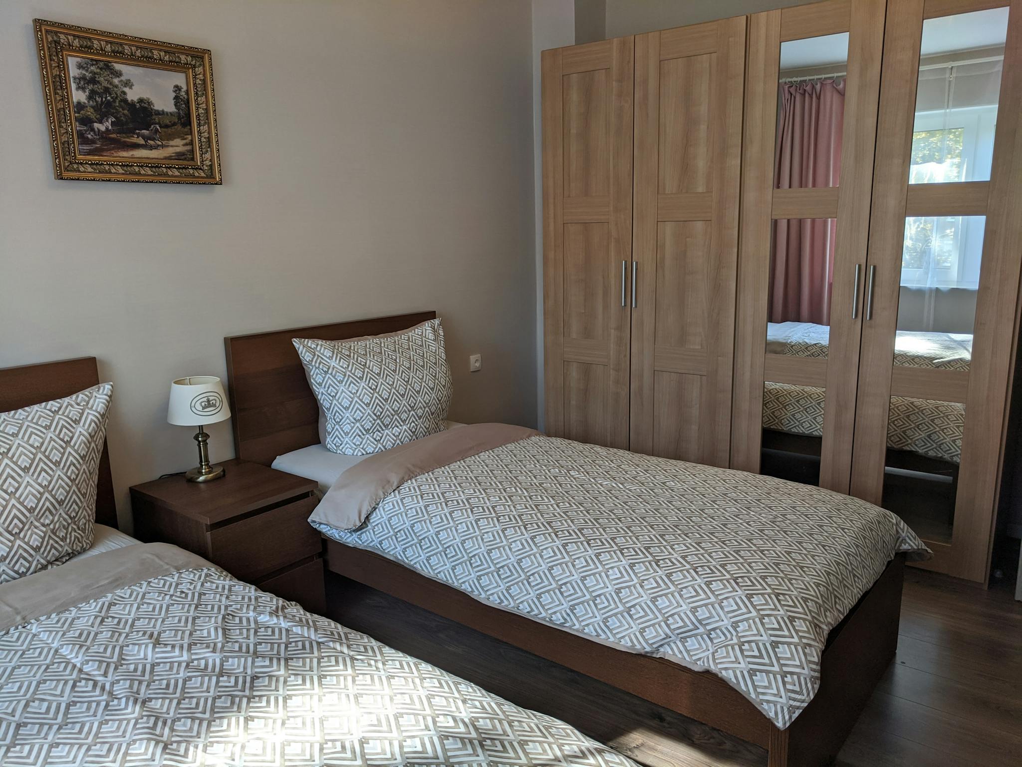 Die Wohnung wurde im Januar 2020 komplett renoviert und ausgestattet. Geräumige, komfortable und moderne Wohnungen mit Highspeed-Internet sind für 4 Personen ausgelegt. Mit der Infrarot-Fußbodenheizung fühlen Sie sich wohl und gemütlich. Die Wohnung besteht aus 2 Schlafzimmern. Eines von ihnen hat 2 Einzelbetten (90x200), 1 Nachttisch ,ein großer Kleiderschrank und (hidden) zweiten Schlafzimmer mit Zugang zu einem riesigen Balkon finden Sie einen große Tisch und 6 Stühle , ein Einzelbett (90x200) , ein bequemes Sofa, das als Bett (140x200) verwendet werden kann, einen Smart-TV (48``). Ein modernes Badezimmer mit Fenster und großer Dusche. Die Wohnung hat auch eine Küche mit allen notwendigen Geräten, Utensilien . Auf dem Balkon ist das Rauchen erlaubt. In der Wohnung ist das Rauchen nicht gestattet.
